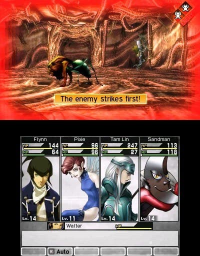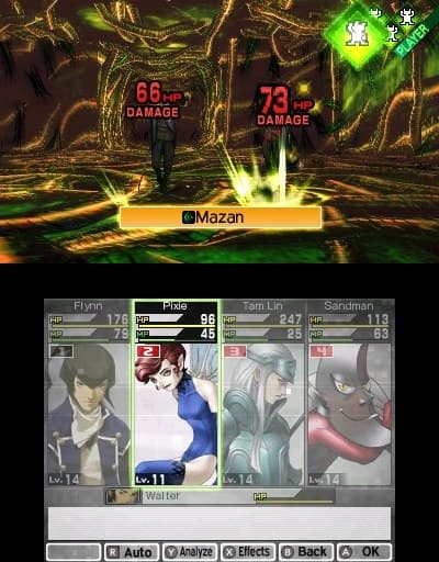 Графически проект выглядит странно. С одной стороны, неплохая модель героя, на которой видна вся экипировка, бегает по трехмерным подземельям. С другой стороны, когда дело доходит до сражений, все красоты испаряются. На поле боя мы видим в большинстве случаев некрасивые спрайты демонов и блеклые эффекты от заклинаний. Такой подход решительно непонятен. Особенно когда другие ролевые игры на 3DS демонстрируют вполне эффектную картинку.