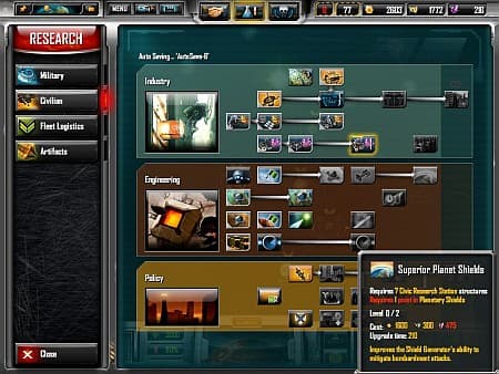 Второй важный сегмент на орбите – это лаборатории, разделенные на два типа – изучение военных технологий и улучшение жизни в империи. Чем больше научных центров висит в космосе, тем более продвинутые решения доступны для исследования. Военные – наращивают тактико-технические характеристики оружия и брони, конструируют прототипы новых кораблей и вспомогательных сооружений. Размер армии – тоже тема для изучения, расширяющая узкие рамки лимитов на численность флота. Гражданские ученые озабочены вопросами ускорения добычи ресурсов и строительства зданий, обеспечения межпланетной торговли и колонизации планет с агрессивной внешней средой, снижения затрат антиматерии на гиперпространственные переходы и усиление действия пропаганды на население захватываемых планет.