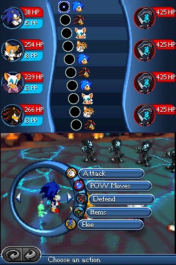 Быстрая анимация атак ускоряет походовое сражение, раздача команд происходит почти мгновенно, а мини-игры в духе Elite Beat Agents во время применения спецприёмов держат в напряжении вплоть до победы. Постоянные перехваты, контратаки, хитрые комбо-удары и забавная погоня за улепётывающими врагами – открывшееся разнообразие просто кружит голову. Однако после впечатляющего промо-показа боевая система ударяется в самокопирование. Скорость боёв оказывается не столь высокой, как хотелось бы Сонику, а три мини-игры на длинный перечень спецриёмов выглядят просто нелепо. Очень скоро вы без запинки будете выстукивать самые сложные ритмы и елозить стилусом по движущемуся кружку – это совсем не сложно и чертовски необходимо во второй половине игры. Сопротивление атакам, регенерация здоровья, постоянные отражения ударов – сложность возникающих проблем даст фору любой «взрослой» ролевой игре. Без использования умений здесь не выжить, а, значит, и без нудного повторения одних и тех же действий на протяжении десяти часов, отведённых на сюжет.