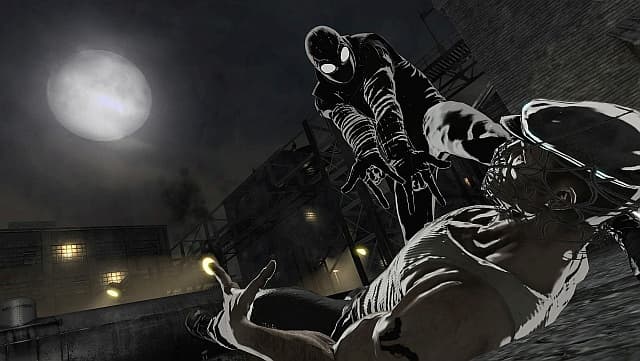 Однако механика «тихой войны» прикручивалась абы как. Наказаний за халатность не предусмотрено, подкрепления к врагам не прибегут, провала не будет, заложников не убивают. Попались на глаза врагам - быстро спрятались обратно в тень, подождали совсем немного, выслушивая их оханья, и отправились дальше на охоту. Эта вселенная с одной стороны не предлагает никаких серьезных испытаний и является этаким расслабляющим буфером. С другой – ближе у финалу с нуарным пауком не хочется расставаться.Всё-таки студия Beenox, ответственная за данную игру, относится к цеху ремесленников и не в состоянии предложить достаточно оригинальных идей для поддержания постоянного интереса. Первое время, когда только происходит знакомство с бестиарием вселенных, желание продолжать путь только усиливается. На аренах появляются неприятели со щитами, здоровяки с гранатами за пазухой, автоматчики, солдаты с базукой наперевес. Ко многим надо искать особый подход. Однако в последствии в ход идёт принцип «Всего того же самого и побольше, побольше!». Количество врагов растёт в непомерных пропорциях. Эффекты застилают экран. Проблематично контролировать обстановку и подбирать наиболее подходящие сочетания ударов. Остаётся лишь молотить по кнопкам в надежде, что поток болванчиков закончится раньше, чем здоровье героя.
