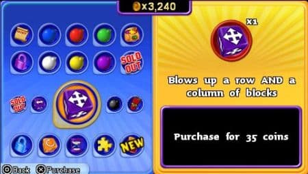 Во-первых, победа в каждой из «миссий», помимо чисто умозрительного набора очков, подразумевает получение денежного приза. Деньги можно потратить в специальных магазинах, на покупку всевозможных вспомогательных средств (power-up’ов). К последним относятся: бомбы одного из шести цветов (взрывают все кубики аналогичного цвета в «стакане»), а также взрывные устройства, позволяющие удалить одну строку или даже целый «перекресток», состоящий из строки и колонны. Помимо этого имеются «миксеры» (перемешивают кубики в случайном порядке), «песочные часы» (на несколько секунд останавливают заполнение строк), и классические гранаты, уничтожающие все кубики в определенном радиусе вокруг себя. Все эти предметы попадаются и в бесплатном виде – иногда выскакивают вместе с очередной строкой. Однако для того, чтобы пройти Quest mode до конца, без помощи «вспомогательных устройств» просто не обойтись – на последних уровнях царят поистине безумные скорости.
