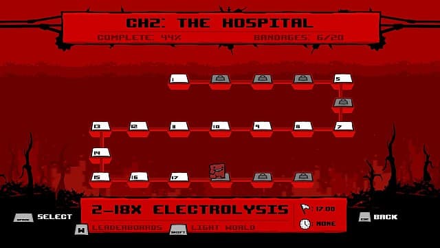 Продвигаясь по, кхм, сюжетной канве, уровни варьируются от по-дружески непростых, до неприятельски сложных. Однако, что удивительно, даже умерев 20 раз кряду, игра не вводит в бешенство, а скорее раззадорит и заставит побить таки этот чертов уровень. Super Meat Boy всей душой старается угодить играющему. Возьмем тот же процесс смерти. Если вы умираете, то мгновенно оказываетесь в начале уровня. Никаких задержек или экранов загрузки – новый парень сразу готов к действиям. В игре, в которой погибаешь очень-очень часто, это очень-очень важный аспект, и очень-очень похвально, что Team Meat его уловили. А по окончанию уровня вас ждет… нет, не тортик, а одновременный повтор всех совершенных пробегов. Бывает очень забавно смотреть за десятком умирающих мясных комочков, один из которых таки достигает своей цели. Все уровни разбиты на несколько разделов, каждый со своей тематикой: лес, больница, соляной завод и т.д. Структура разделов представляют собой 20 уровней с секретным ВАААААРП зонами и битвой с боссом под конец. Хотя это не столько битва, сколько большой и сложный для выполнения уровень, в котором помимо нашего героя обязательно будет присутствовать какой-нибудь большой и злобный монстр, вздумавший порушить все надежды Мясного на спасение своей подружки. Тот же Dr. Fetus.Вдобавок ко всему, Team Meat приготовили еще и Темный Мир с усложненными версиями уровней, который открывается, как только вы сможете пройти оригинальную карту за отведенное время.