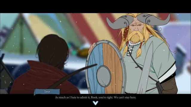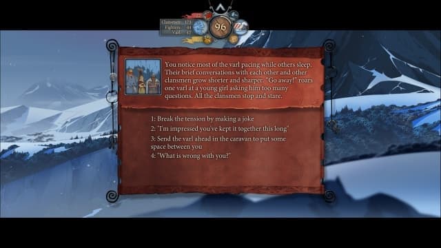 История подается в текстовом виде, роликов очень мало, диалоги между нарисованными фигурами героев редко посещают экран. Гораздо чаще приходится, как в книге-игре, просто читать строки и выбирать варианты ответов. Причем требуется не просто хорошее знание английского языка, а отличное, поскольку в The Banner Saga используется непростая лексика, а выбирать действия наобум крайне не рекомендуется.