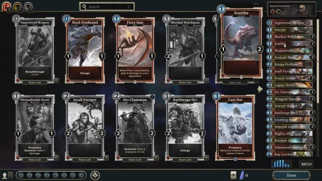 Что касается игровых колод, то процесс их создания крайне интересен. Как уже упоминалось, героев с привязкой к определенным картам, как в Hearthstone, здесь нет. Зато есть пять разноцветных стихий, как в Magic: The Gathering. Называются они, согласно терминологии The Elder Scrolls, — «Сила», «Интеллект», «Воля», «Ловкость», «Выносливость». Однако сути это не меняет. Помимо этого, есть бесцветные карты, которые можно затасовать в любую колоду, и двухцветные — подходят для строительства колод двух определенных цветов.