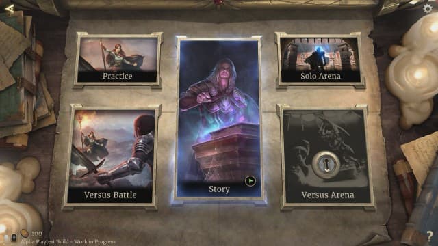 Судя по предоставленному в бета-версии контенту, Bethesda делает ставку не только на дуэли между игроками. Два значительных блока игры — «История» (Story) и «Арена» (Solo Arena) — предназначены для одиночных сражений против ИИ. Кампания повествует нам историю, как это принято в серии The Elder Scrolls, беглого заключенного, который проходит через многочисленные испытания, сражается с волками, пауками, зомби, бандитами и чернокнижниками ради спасения императора. Сюжет незатейлив и подается в виде озвученного рассказа на фоне статичных картинок. Впрочем, есть в нем своя прелесть, поскольку через него, проходя битву за битвой, мы получаем доступ к новым картами и колодам.