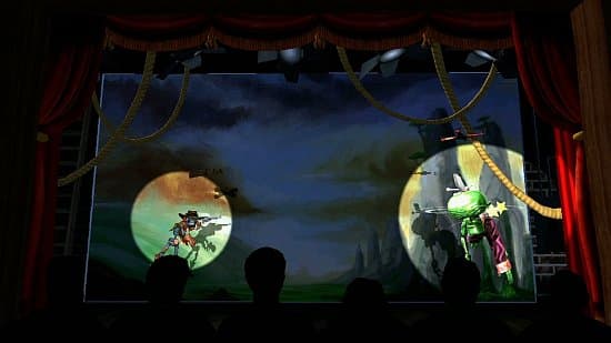 Однако нам важна не сама история о мести, а как она подается. О, сумасшествию Twisted Pixel мало кому удастся составить компанию в палате с мягкими стенами. Все действие, представьте себе, разворачивается на сцене кукольного театра. Есть зрительный зал с охающими и аплодирующими зрителями, есть деревянные герои и фанерные декорации. Есть даже рассказчик, который своими долгими речами посрамил бы прославленных римских ораторов! А еще тут есть игрок, который выполняет роль кукловода. Итак, мы садимся или становимся напротив телевизора (приятно, что тут позволяют удобно развалиться в кресле, редкость в играх для Kinect), проходим процесс узнавания и берем действие в свои руки. В буквальном смысле. Левая рука “держит” перекрестье с идущими вниз, к фигурке скелета, ниточками. Так мы управляем его движениями. Вправо-влево, прыжок, выглядывания - ничего сложного, учитывая, что вперед он движется самостоятельно.