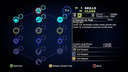 В первой ветке три линии развития. Во второй — две. В каждой линии — по шесть навыков, и только два из них активные (автоматически помещаются на кнопки «X» и «Y»). Остальные пассивные, направленные на улучшение собственных характеристик. В любой момент времени можно сбросить очки опыта и раскидать их заново, так что мучиться из-за неверного решения не приходится.
