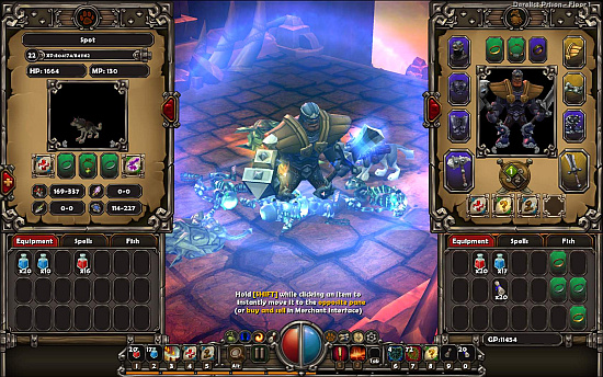 Но еще увлекательнее выглядит возможность трансформации любимчика в одного из десятков монстров, среди которых имеются по-настоящему полезные экземпляры: големы, элементали, различные магические существа. Чтобы заполучить в напарники перевертыша, питомца следует накормить рыбешкой, что в достатке водится в разбросанных по уровням «лункам». Время метаморфоза невелико и зависит от величины улова – 120 или 3600 секунд. Ну, а если очень повезет – можно вытащить и гигантскую рыбину, обращающую питомца навсегда.Игровой интерфейс довольно типичен – полусферы манны и здоровья, быстрые слоты под часто используемые заклинания. Инвентарь не менее стандартен: кукла персонажа, отделения под разнообразные вещи и заклинания. Все предметы занимают ровно один слот, но рюкзак сам по себе небольшой. Впрочем, не стоит забывать, что свободное место всегда найдется в ранце у питомца, который, к слову, даже умеет сам поднимать вещи с пола. С выпадающими «золотыми» разработчики поступили еще изящней – кучки наличности подбираются автоматически при приближении героя.