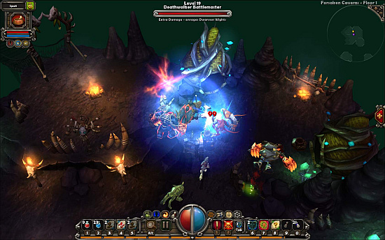 Уже на этапе инсталляции игра поражает скромными системными требованиями – опробовать Torchlight смогут даже ярые противники «железных» апгрейдов и владельцы далеко не самых производительных нетбуков. Отчасти это заслуга свободно распространяемого движка O.G.R.E., который и лег в основу игры. Да, игрушка не поражает техническими аспектами: эффекты довольно простенькие, текстуры – «акварельные», а моделям и окружению явно не повредили бы несколько «полигональных» инъекций. С другой стороны - дизайнеры постарались так, что на техническую отсталость проекта перестаешь обращать внимание уже спустя 10 минут: Torchlight на удивление обаятельна и легко располагает к себе.На выбор игроку предложат один из трех классов: Destroyer (типичный «танк»), Vanquisher (девушка с фамильными чертами амазонки) и Alchemist (маг). Вне зависимости от сделанного выбора, героя в его странствиях по подземельям будет сопровождать питомец – рысь или волк, на усмотрение игрока. У каждого класса имеется по три ветки умений. Destroyer, к примеру, может пройти специализацию на использовании двух экземпляров оружия одновременно, сделать акцент на атакующем или защитном развитии, и т.д. Часть умений получилась общей для всех трех классов – усиление защитных или атакующих заклинаний, совершенствование навыков четырехлапого напарника и ряд других.На питомце стоит остановиться подробнее. Помимо поддержки в сражениях, «лучший друг человека» имеет свой собственный инвентарь и даже может «примерить» на себя некоторые украшения. Что еще важнее – зверюге позволяют передать два заклинания, которые тот вполне самостоятельно будет время от времени использовать. Учитывая, что ограничений на передаваемые заклинания не существует, игрок может создать из питомца любой вариант – от «аптечки на лапках» до «ученика мага». Еще одна полезная функция хвостатого партнера – посыльный. Когда оба инвентаря окажутся перегружены ценным скарбом – «командируем» зверька одним нажатием кнопки к деревенскому торговцу, «разгрузить закрома».