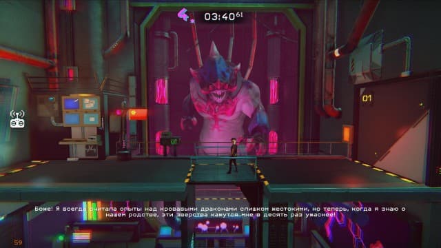 С пародийно-развлекательной историей у Trials of the Blood Dragon не все гладко. За пределами сумасбродной концовки смешных шуток мало. Некоторые забавные реплики персонажи говорят под руку, прямо во время напряженных поездок на мотоцикле/велосипеде. Не всегда успеваешь уловить мысль и оценить юмор. Но хуже всего то, что в начале игры нам сообщают о гибели протагониста Far Cry 3: Blood Dragon Рэкса Кольта! Роль главных героев отводится двум его детям. У этих подростков нет и миллионной доли крутости их отца. Это блеклые и незапоминающиеся персонажи. Они бесконечно далеки от живого воплощения всех знаменитых героев боевиков 80-х и 90-х годов, коим был Рекс Кольт. Поэтому ролики в рисованном стиле чаще разочаровывают пустой болтовней.
