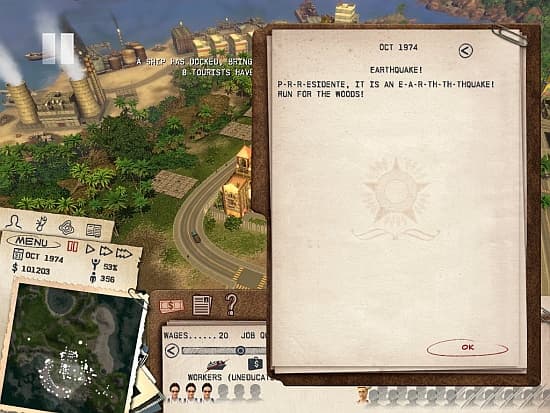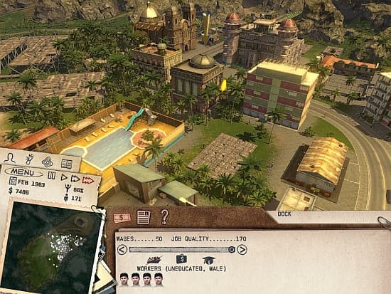 Экспорт фруктов, дерева и полезных ископаемых станет источником финансов для модернизации производства, создания сильной индустрии туризма, строительства жилья и социальных объектов. Начинать лучше с поставок сырья – бревен, табака, сахара, но постепенно копить денежки на следующее звено обработки – фабрики. Мебель, сигары, ром, консервированные фрукты, украшения из золота – с такими товарами экономика резко рванет вперед.Самое важное для нашей республики здание – министерство иностранных дел. Два могущественных партнера – СССР и США – могут сделать очень многое для развивающейся страны. Безвозмездная финансовая помощь, лагерь «врачей без границ», бесплатное строительство важных объектов, увеличение прибыли экспортных товаров, оплаченная аренда военной базы, даже на испытаниях ядерного оружия можно заработать легкие деньги. Главное не забывать в своей внутренней политике о приверженности идеям одной из сверхдержав.Не менее важны инвестиции в человека. Президент лично решает что, где и когда строить, повышать ли зарплату работникам отдельных предприятий, вводить ли пенсии и стипендии, отменять ли налоги в преддверии новых выборов. Доступное жилье, бесплатное питание и медобслуживание, качественное среднее и высшее образование, недорогие развлечения – довольные жители станут гарантией политической стабильности. Строительство новых объектов развязывает руки эль Президенте, позволяя применять в отношении оппозиционеров новые методы и принимать указы, которые серьезно влияют на развитие общества и экономики. Продовольственный рынок даст старт кампании по борьбе с голодом, школа – программе по ликвидации безграмотности. Заводам высочайший указ ограничит вредные выбросы. Появление церкви – позволит ввести или отменить запрет на контрацептивы, особенно актуальный для прироста населения. В новенький кафедральный собор можно пригласить Папу Римского. В модный клуб – ангажировать визит популярной группы. Телевизионный центр по первому сигналу запустит рекламу национальных товаров. Соревнования, карнавалы, разрешение на однополые браки – привлекут туристов. Хорошо гражданам – популярность вождя растет, а политические противники теряют остатки рейтинга.