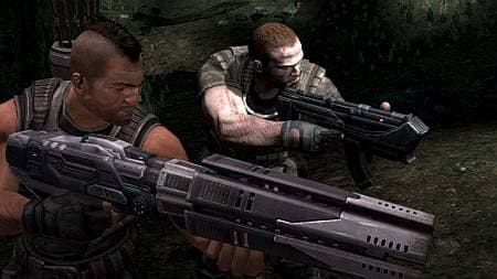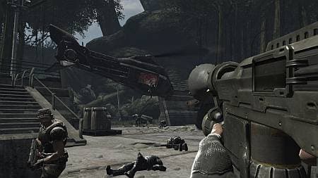К тому же любоваться в процессе путешествия нечем. Джунгли в исполнении Propaganda Games представляют собой последовательность полянок, связанных между собой коридорами. Валяющиеся кое-где недоеденные останки – вот и все достопримечательности. Помимо открытых пространств на пути с чертовой планеты герой посетит типовые военные комплексы и пещеры. Отличий немного, лишь зелёная гамма уступает место серой.
