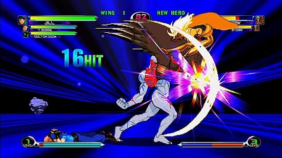 Со стороны Capcom ситуация чуть осложняется тем, что некоторые персонажи сюда притопали из совсем древних хитов компании. Вам говорят о чем-нибудь такие названия, как Darkstalkers, Captain Commando или SonSon? Если да, то отлично. Впрочем, костяк героев все равно будет хорошо знаком даже новичкам, которые с играми начали знакомство сравнительно недавно. Тут вам и орава «уличных бойцов», и Мегамен со своей потешной компанией, а серию Resident Evil представляет скромница Джилл Валентайн в синем берете.Капкомовские ребята также получились заметно круче своих прототипов из оригинальных проектов. Пламя Дхалсима бьет чуть ли не на весь экран. Джилл превращается в повелительницу зомби и зверей с реактивным гранатометом под мышкой. Мегамен из скромного паренька в смешном скафандре легко трансформируется в гигантского робота – куда там, гандамам.Естественно, простые обмены ударами тут не в почете (отнимают очень мало здоровья) и служат лишь для накопления пятиуровневой шкалы «Гипер-Комбо», которая позволяет активировать многочисленные супер-приемы (по нескольку штук на каждого персонажа!). А там уж начинается феерическое шоу, где из-за огня и спецэффектов сложно рассмотреть фигурки героев.