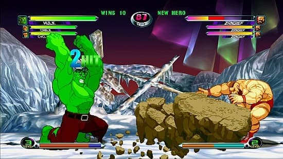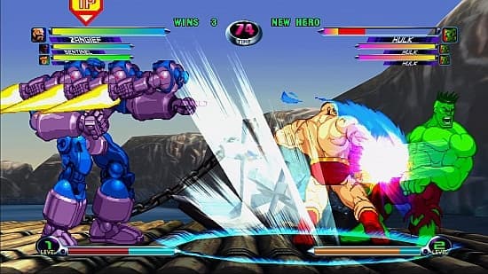 Герои прыгают по арене дурными кенгуру, обрушивают друг на друга титанические удары и катастрофические супер-атаки. За происходящим с непривычки больно смотреть: кто, кого, где, откуда. Приходится напрягаться, чтобы просто уследить за бойцами, не перепутать своего и чужого! Реакция требуется молниеносная, но и доскональное изучение правил приветствуется. Чего-чего, а секретов и подводных камней тут множество. Без ознакомления с мануалом, где на нескольких страницах перечислены расшифровки малопонятных иероглифов, тут в принципе делать нечего, если вы хотите чего-то добиться.Впрочем, только этим достоинства Marvel vs. Capcom 2 не ограничиваются. Ведь этим летом состоялось возрождение замечательного файтинга для платформ Xbox 360 и PS3! Загружаемая игра доступна, соответственно, только через XBLA и PSN, «весит» немного (всего-то 200 МБ), да и стоимость для такого шедевра терпимая – 535 рублей.Над римейком работала знакомая студия Backbone, что подарила нам не так давно Super Street Fighter II Turbo HD Remix. И если последняя грустно растворилась за кулисами сразу после триумфального выхода Street Fighter IV, то Marvel vs. Capcom 2 оказалась востребованной: проснулся дикий голод по двухмерным файтингам. Желательно оригинальным, большим и глубоким – чтоб еще на десять лет хватило. А тут уж лучшей кандидатуры не найти.