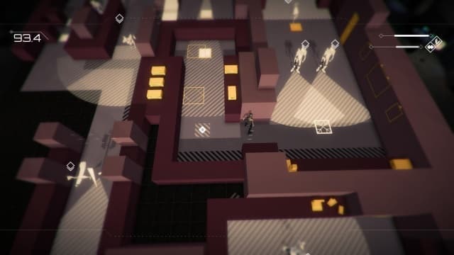 Даже в симуляции Роберт никого не убивает. Он пробирается по узким проходам и небольшим помещениям, прижимается к укрытиям, проползает под носом у охранников или отвлекает их свистом. Вся полезная информация отображается непосредственно на окружении, будь то область видимости патрульных или интерактивные объекты.