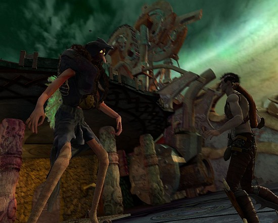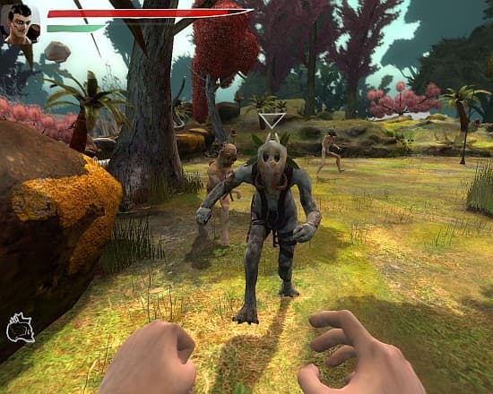 По возвращению в реальность обнаруживаем, что некоторые галлюцинации вполне осязаемы. Во всяком случае, из фантазии дизайнеров появились на свет и разношерстная ватага противников, и вычурные декорации, и специфический арсенал. На экране не будет двух одинаковых гуманоидов, разве что по дороге попадется уже виденный экземпляр. Образы слонолюдей, человеко-ящериц, котосапиенсов и прочих прямоходящих завершены до последнего пятнышка на шкурке и трещины на бивне. Их мир – это переплетение растений и механизмов, гор с волнистыми линиями и прямых по горизонтали веток деревьев, острые потолки и круглые стены, темные с редкими светильниками подземелья, и безумной красоты ночное фиолетовое небо.Под местным светилом за опасное оружие считаются высушенные рыбки-пистолеты, костяной меч из берцовой кости, спаренный арбалет, стреляющий каменными черепами, ржавая винтовка с первобытным способом зарядки, гранатомет, собранный из рогов и копыт – подозрительно странно, что в этот список попала совершенно нормальная кувалда.