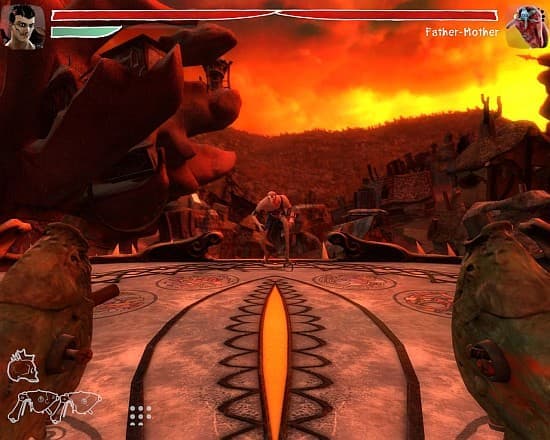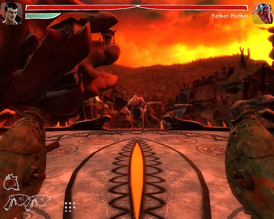 Собственно, с грибочков мы и начнем. Обучение азам местных единоборств происходит большей частью по ту сторону реальности. Расслабляюще плывущие контуры и неестественно яркие цвета абсолютно не мешают сфокусировать внимание на словах тренера и выполнить пару приемов на излишне агрессивных галлюцинациях. Зубрежке подлежат: разовые «прямые» и серии быстрых ударов кулаками, постановка и пробивание блока, ловкое уклонение и мощная контратака, пинки ногами по промежности и болевой тычок локтем с разгона, наконец, расправа над ошеломленным противником. Там же – в мире иллюзий научимся швырять гранаты-черепа и стрелять по кудахтающим мишеням, которым для прыти оторвут головы.