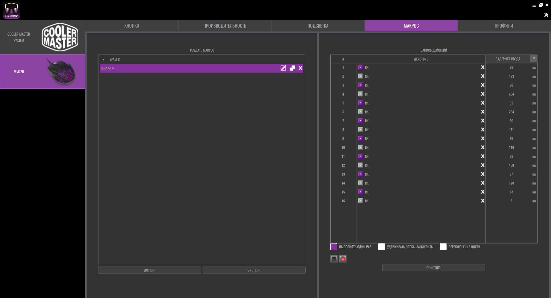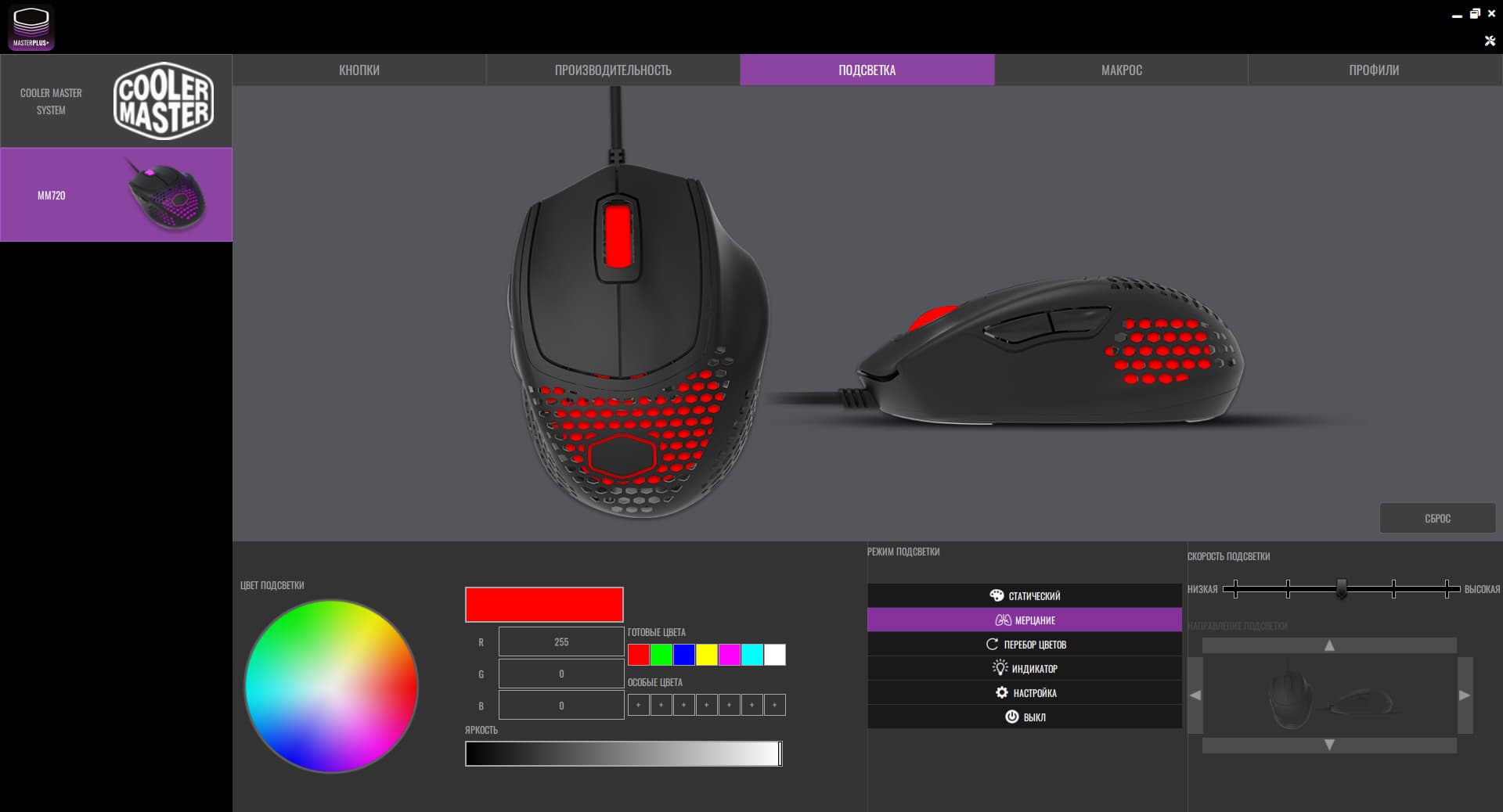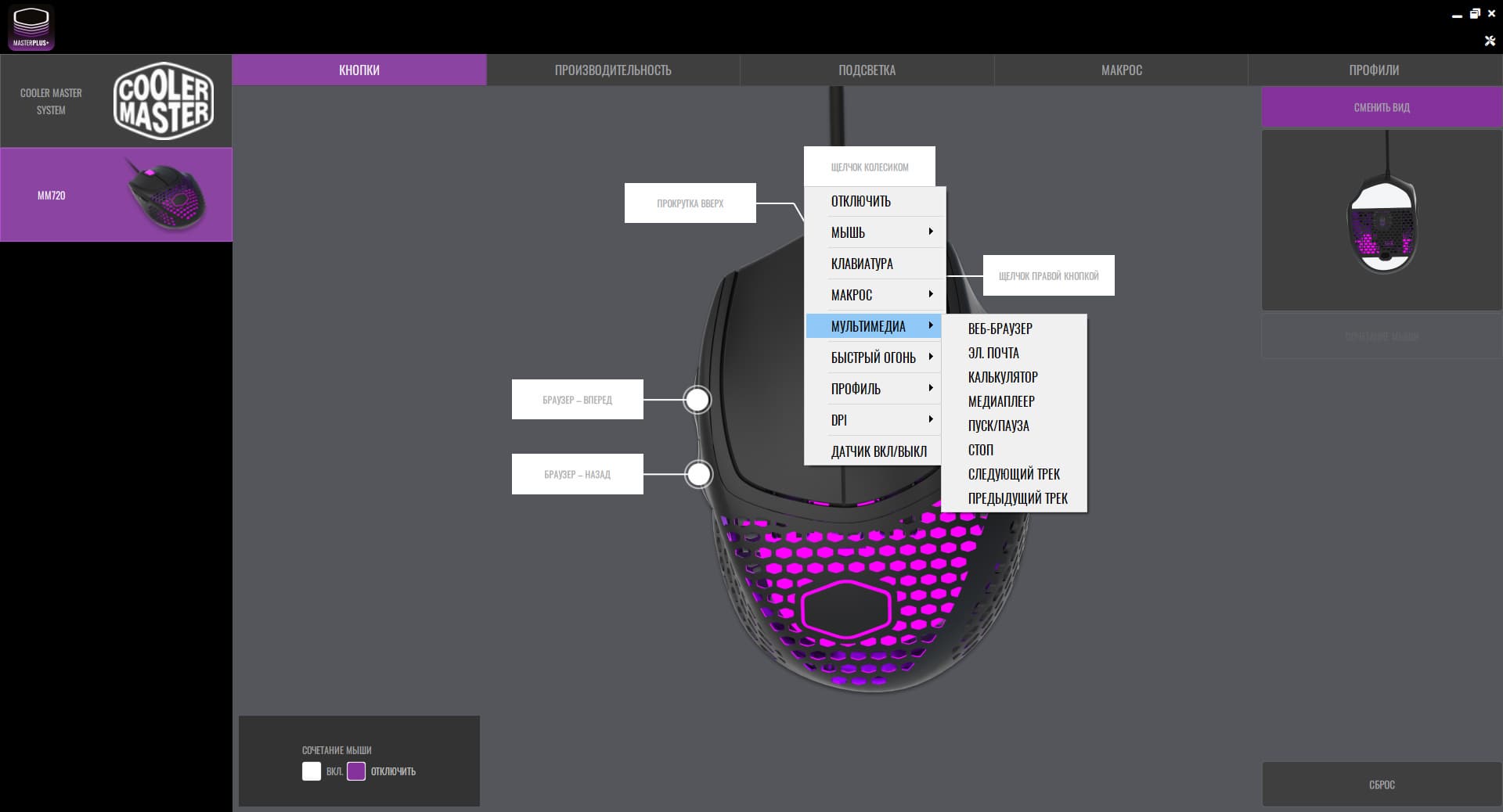 Мышь настраивается при помощи фирменного приложения Cooler Master MasterPlus. Октрыв программу, видим стандартный набор вкладок: кнопки, производительность, подсветка, макрос и профили.