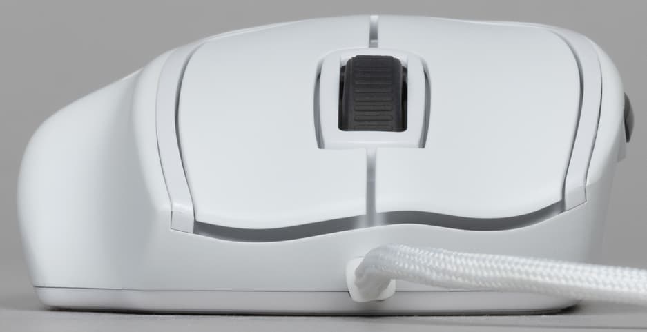 На белом корпусе резко выделяются серое колесико и две черные боковые кнопки. Колесико полупрозрачное и при включенной подсветке светится любым цветом по выбору, это можно настроить через фирменное приложение.