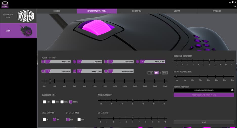 Вкладка «Производительность» уже интереснее. Здесь настраивается чувствительность сенсора для семи переключаемых режимов CPI. Причем для каждого режима чувствительность настраивается не только по оси X, но и по оси Y. Также здесь можно настроить время отклика как переключателей, так и сенсора. У переключателей время отклика варьируется от 4 до 32 мс. Ну и откалибровать мышь по поверхности здесь тоже можно.