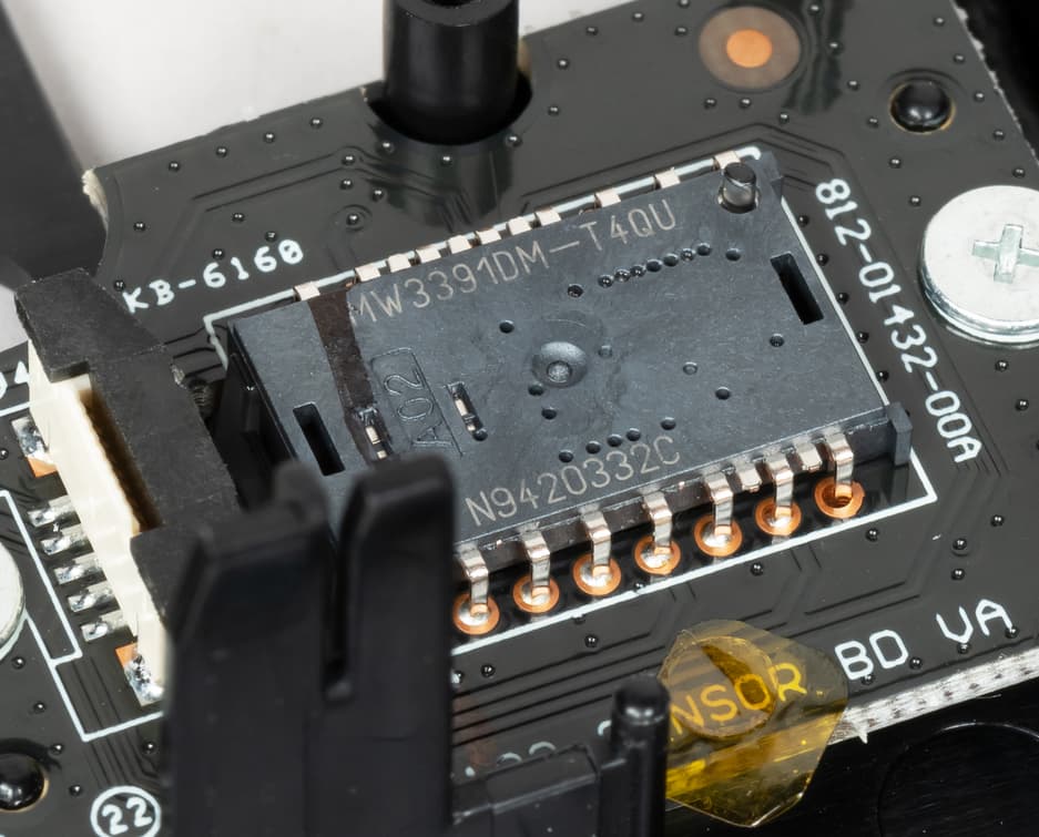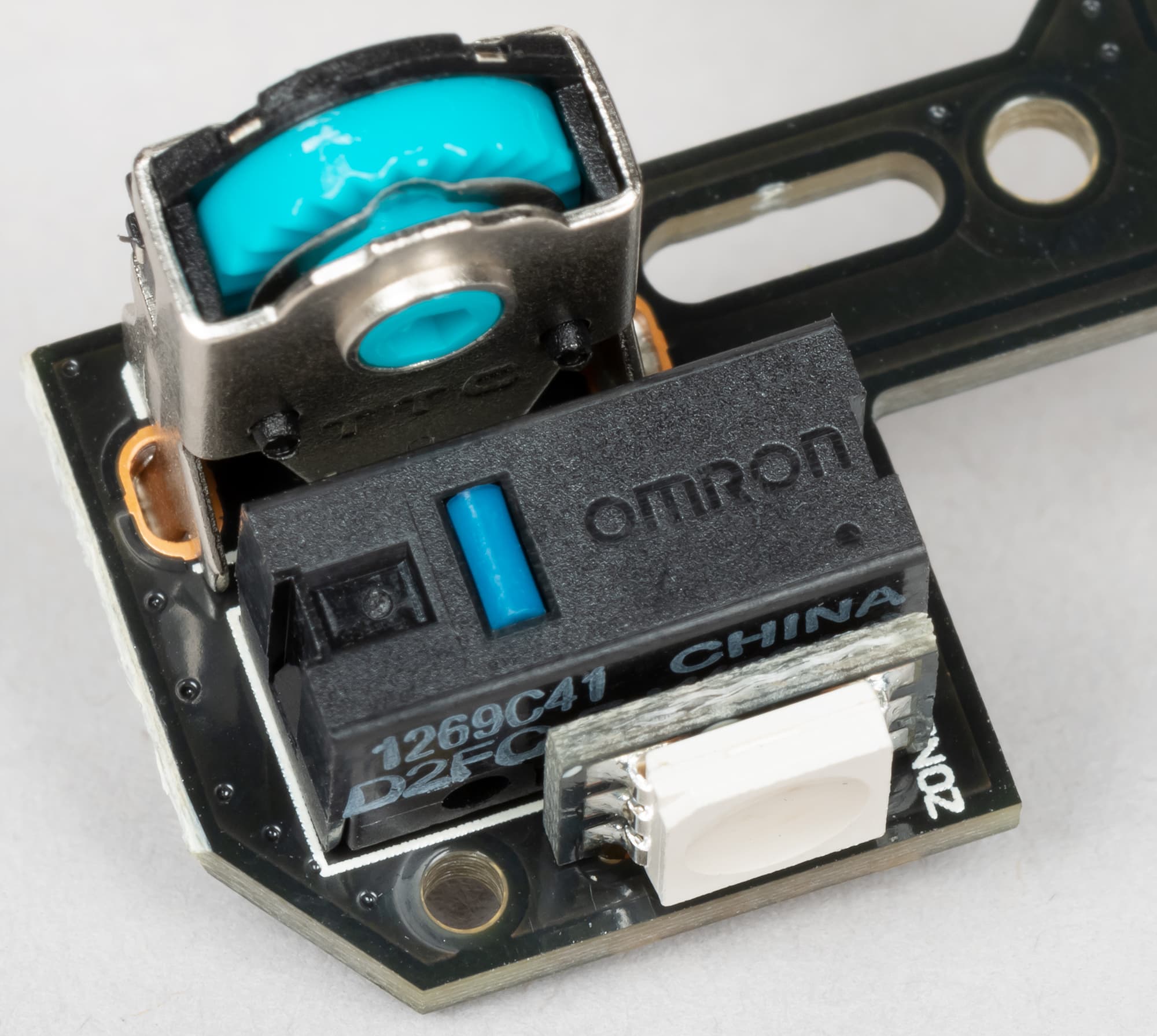 Переключатели под основные клавиши мыши это популярные Omron D2FC-F-K с заявленным ресурсом в 50 миллионов нажатий.