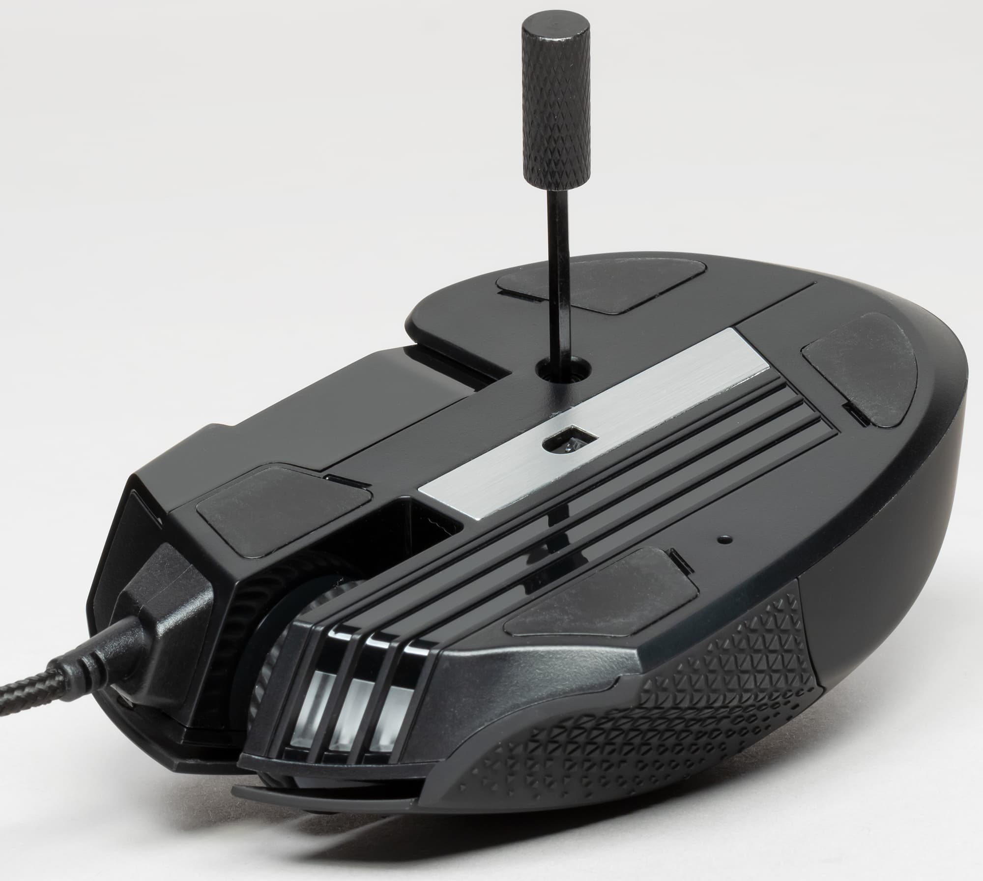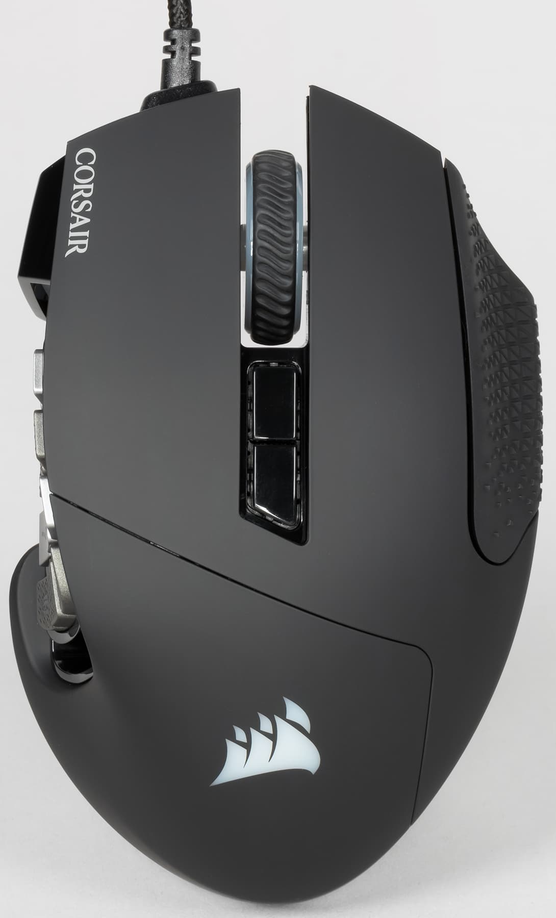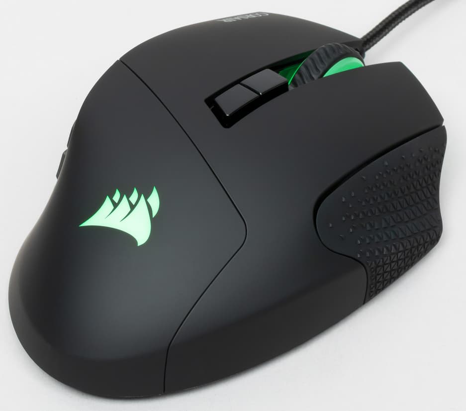 Мышь имеет четыре независимых зоны RGB-подсветки: колесо прокрутки, логотип Corsair на задней стороне верхней панели, кнопочный блок на левой стороне и зону подсветки на передней панели. Также слева есть светодиодный индикатор, оповещающий игрока о том, какой режим CPI включен сейчас.