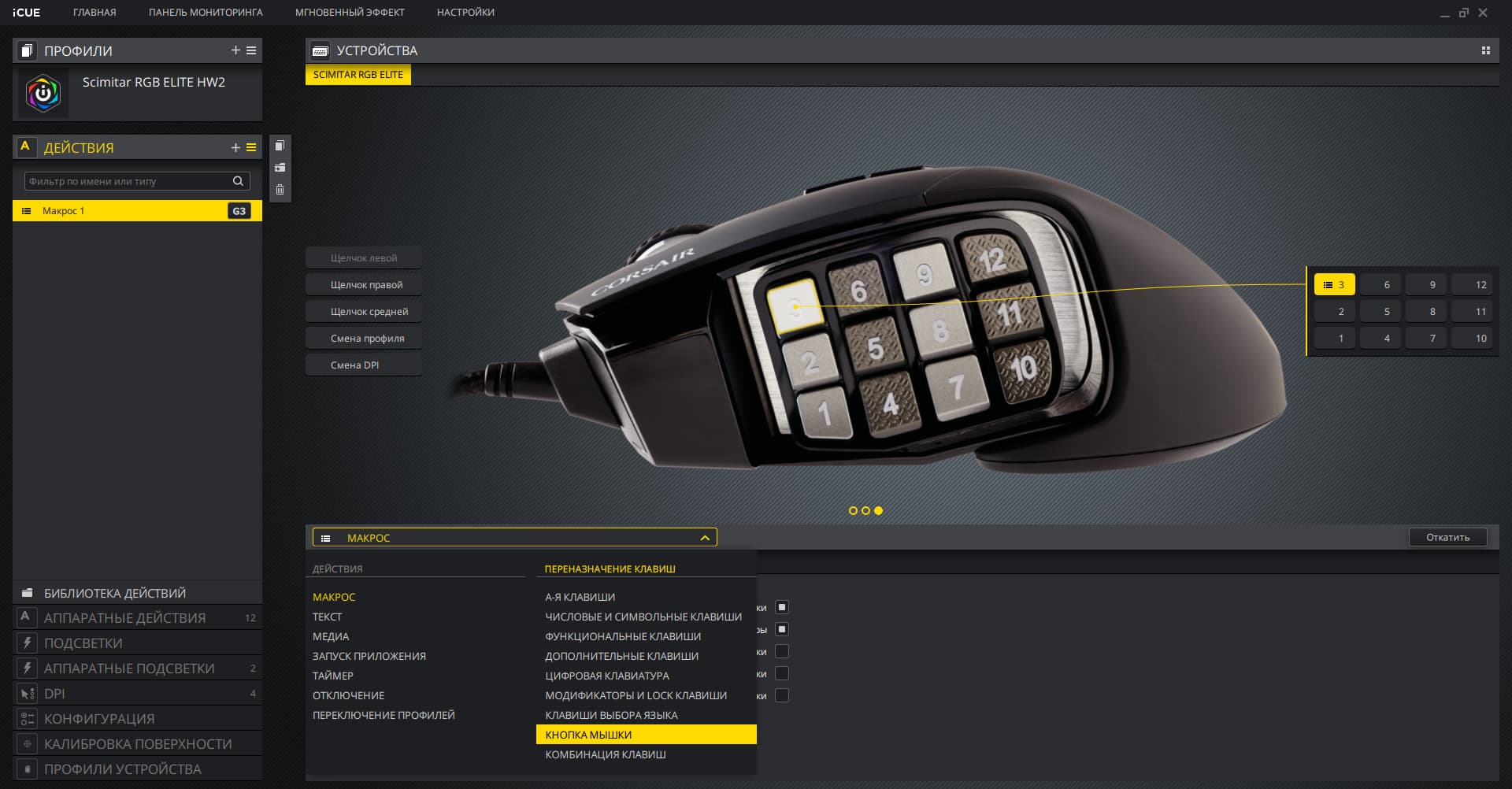 Во вкладке «Действия» переназначаются клавиши и записываются макросы. Можно назначить на клавишу цифру или букву, можно функциональную клавишу или системную команду, можно комбинацию или даже целую последовательность комбинаций — все что угодно. Это значительно расширяет возможности мышки и делает ее удобной не только как игровое устройство, но и как инструмент для видеомонтажа, например.