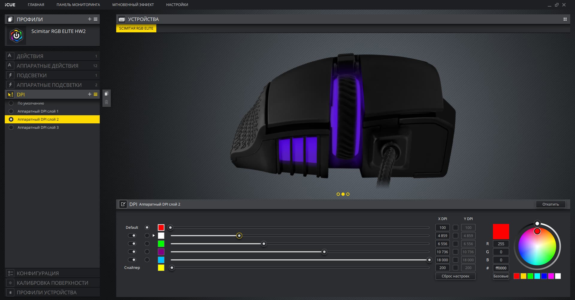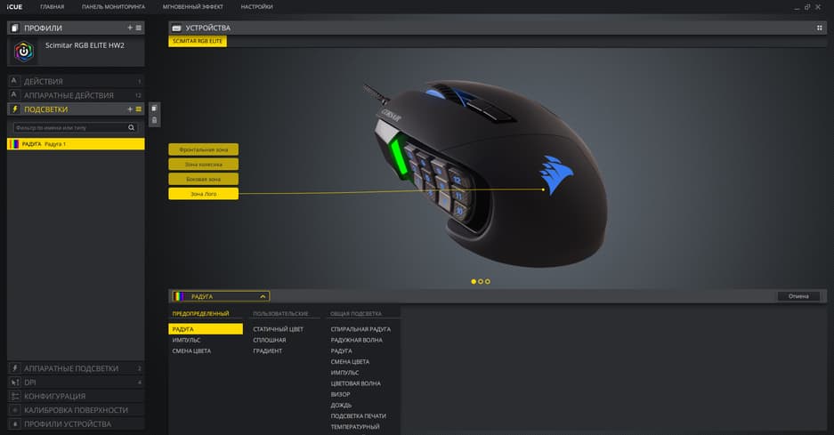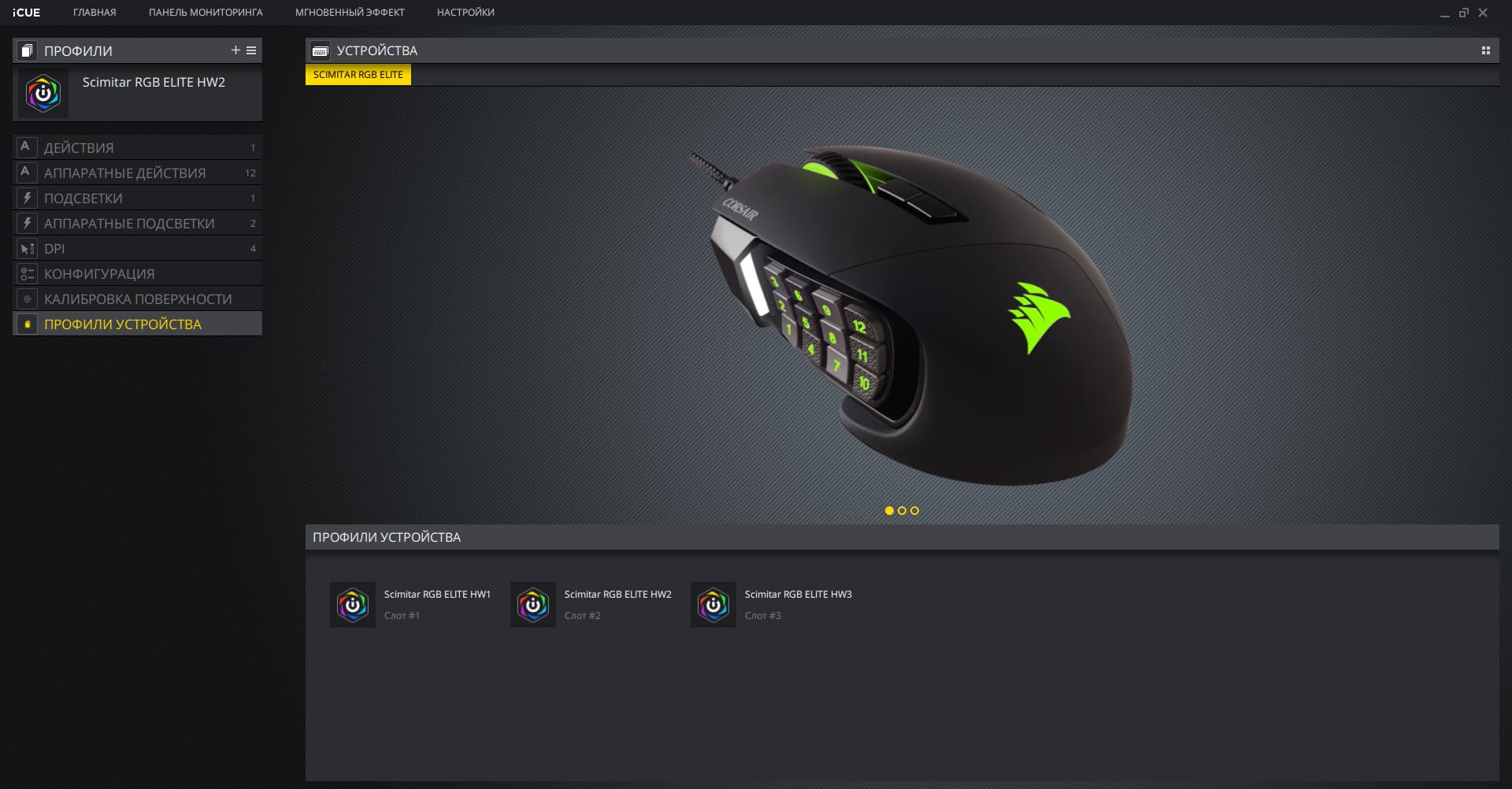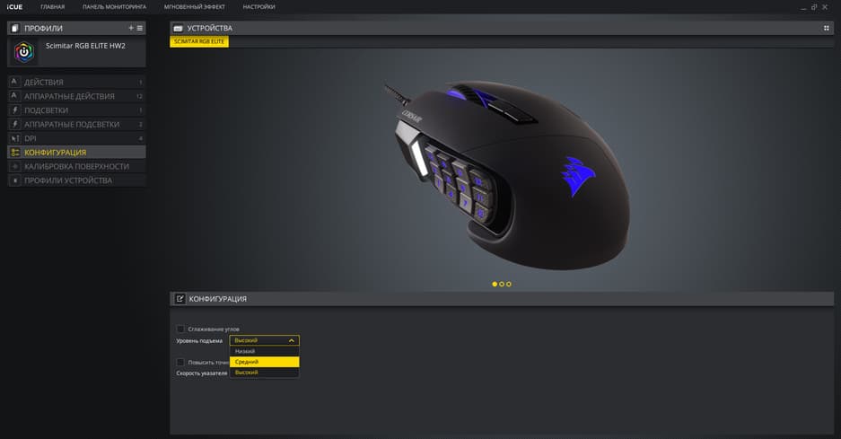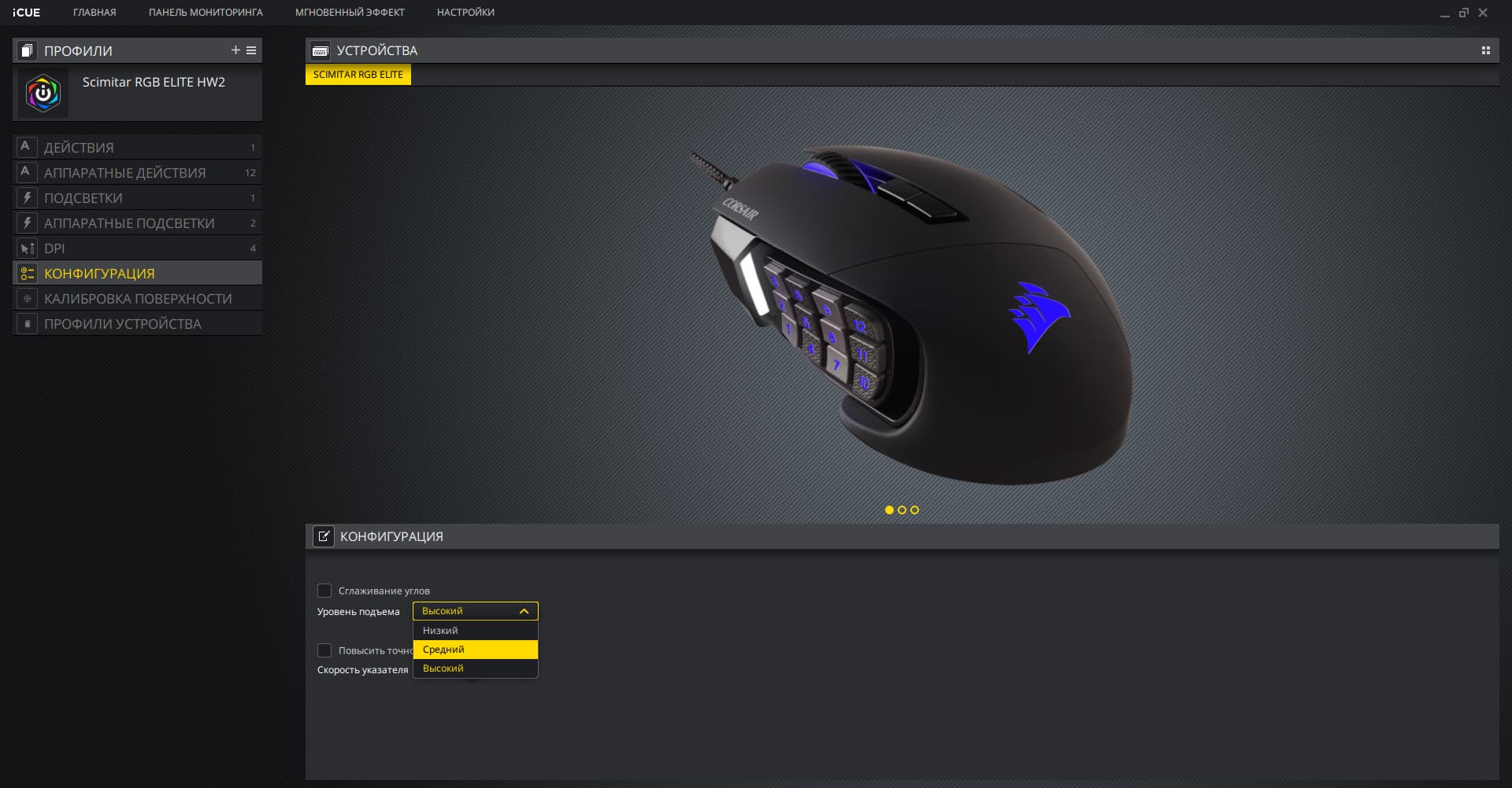 Мышка настраивается с помощью программы iCUE, общей для всей периферии Corsair. Однако работает устройство и без этой программы. Встроенная память мышки содержит три перезаписываемых пользовательских профиля с настройками подсветки, макросами и CPI. Эти три профиля будут доступны на любом компьютере и без установленной iCUE. А вот если трех профилей не хватает, можно создать сколько угодно профилей, но без фирменного приложения они работать не будут.