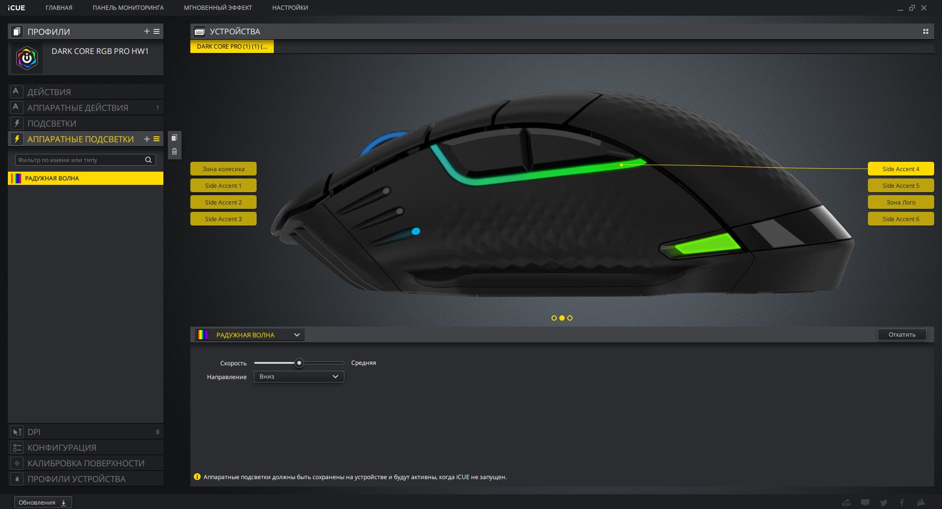 И, конечно, подсветка. Как я уже говорил, Corsair нечасто делают мышки, подсветку которых можно настроить как-нибудь, кроме смены цвета или статического цвета. Тут же большая боковая полоса сразу из четырех светодиодов. Вариативность огромная! Настраиваются все светодиоды отдельно, а не одной зоной, поэтому, чтобы создать что-то эффектное, придется повозиться с настройкой.