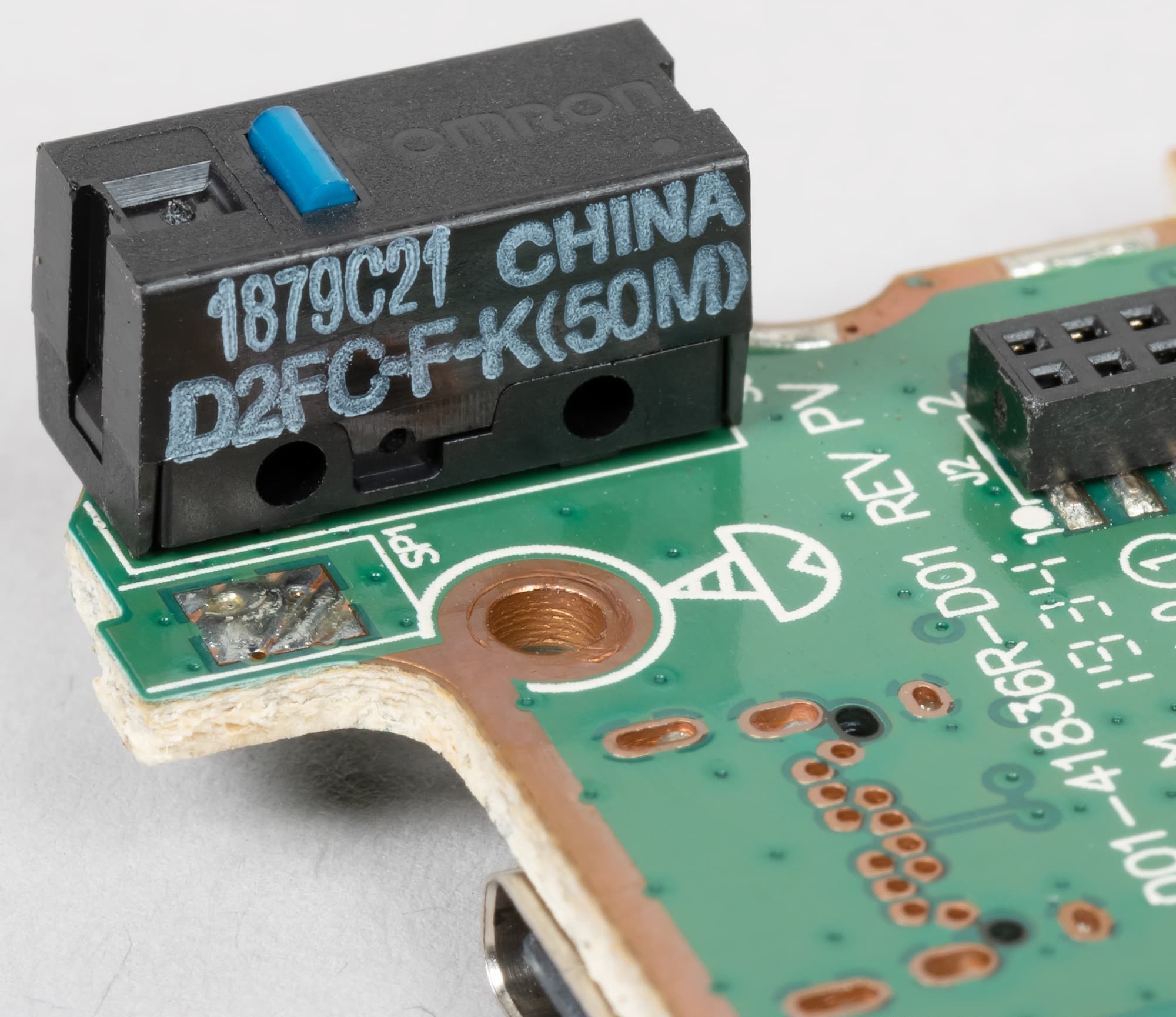 Основные переключатели здесь — классические Omron с маркировкой D2FC-F-K. Для них производителем заявлен ресурс в 50 миллионов нажатий.