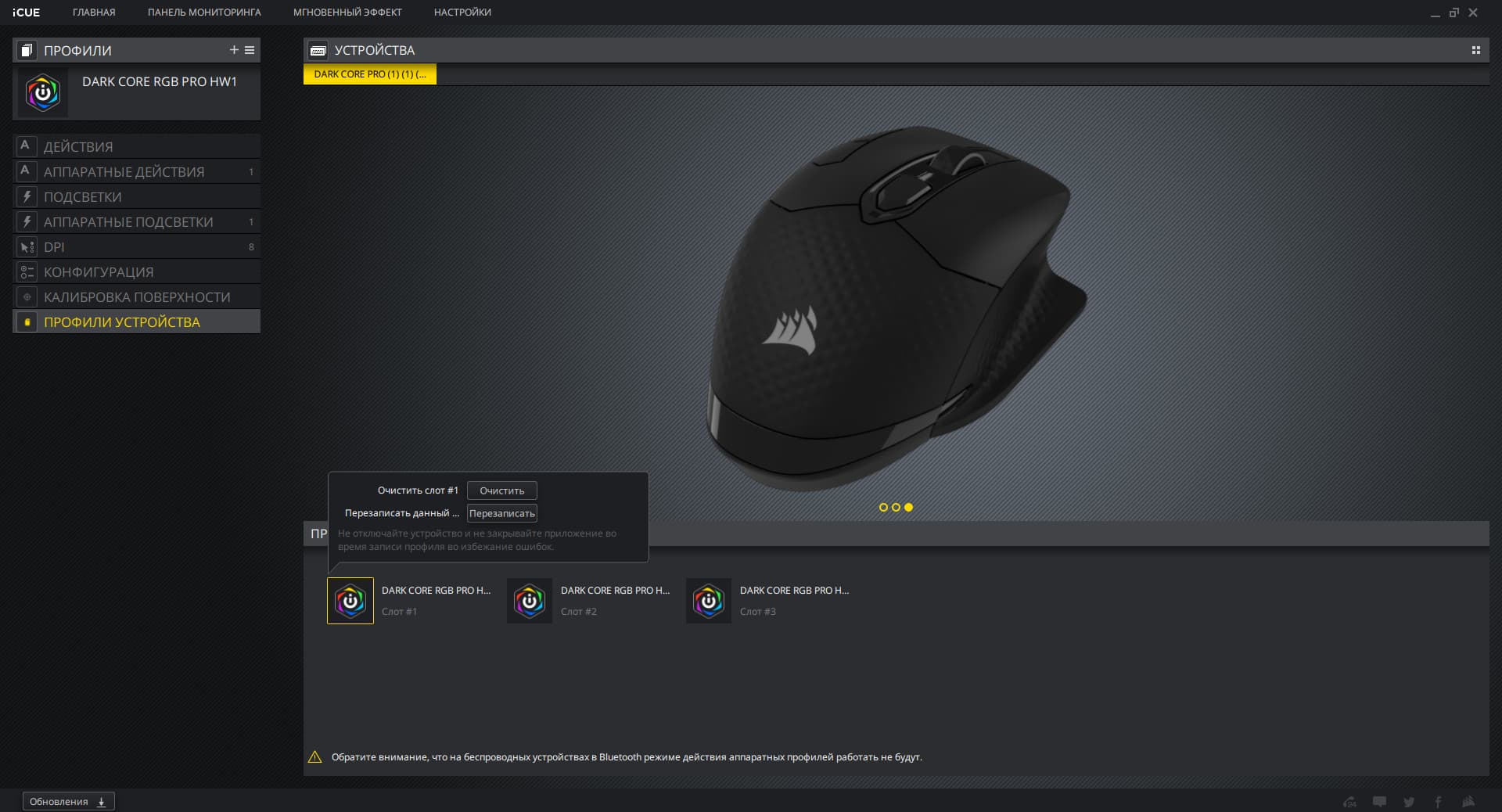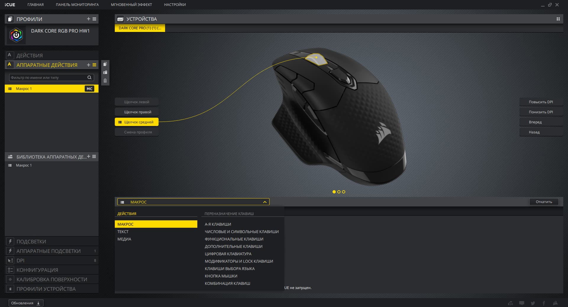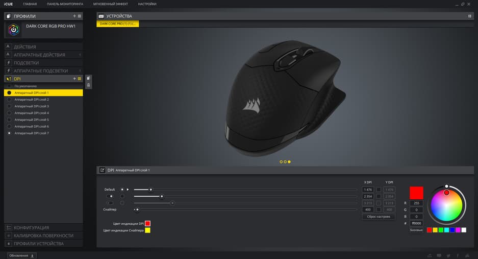 Как и вся периферия Corsair, Dark Core RGB Pro настраивается при помощи фирменной утилиты iCUE. При этом мышь можно использовать с ходу и на компьютерах без этого приложения, в таком случае устройство использует три встроенных профиля, которые записаны в память мышки. А вот при помощи iCUE можно не только менять эти профили, но и создавать свои.