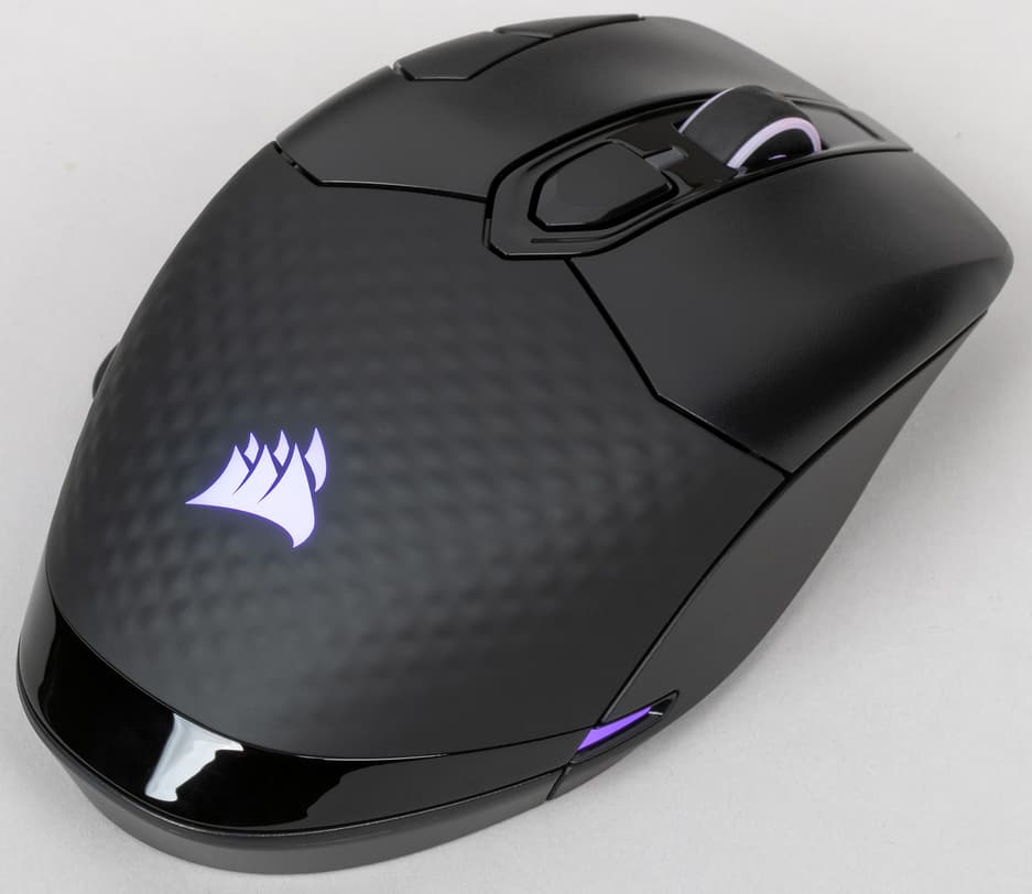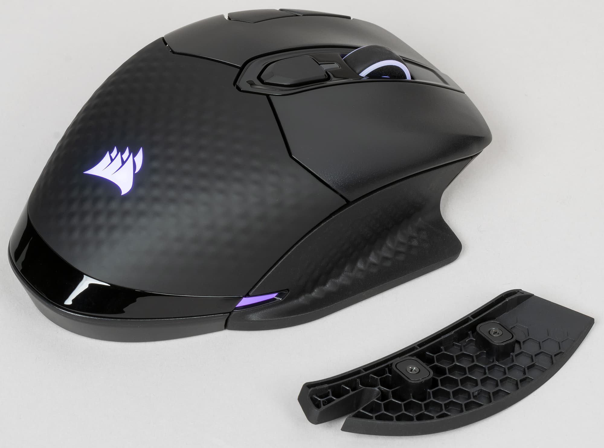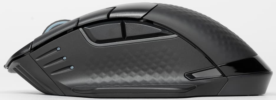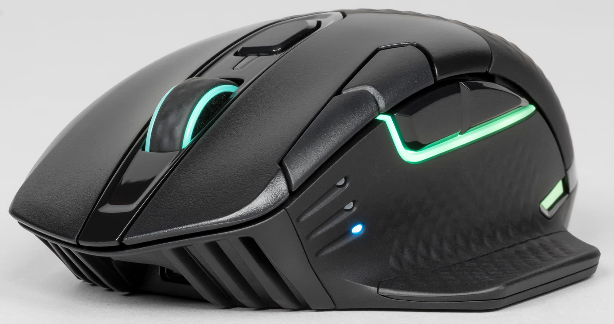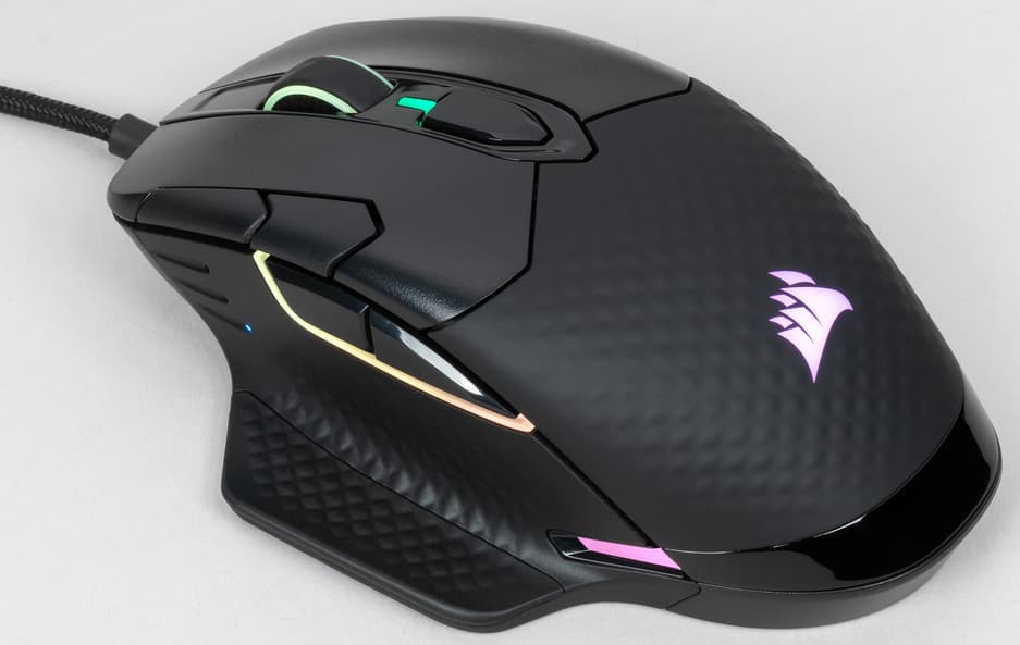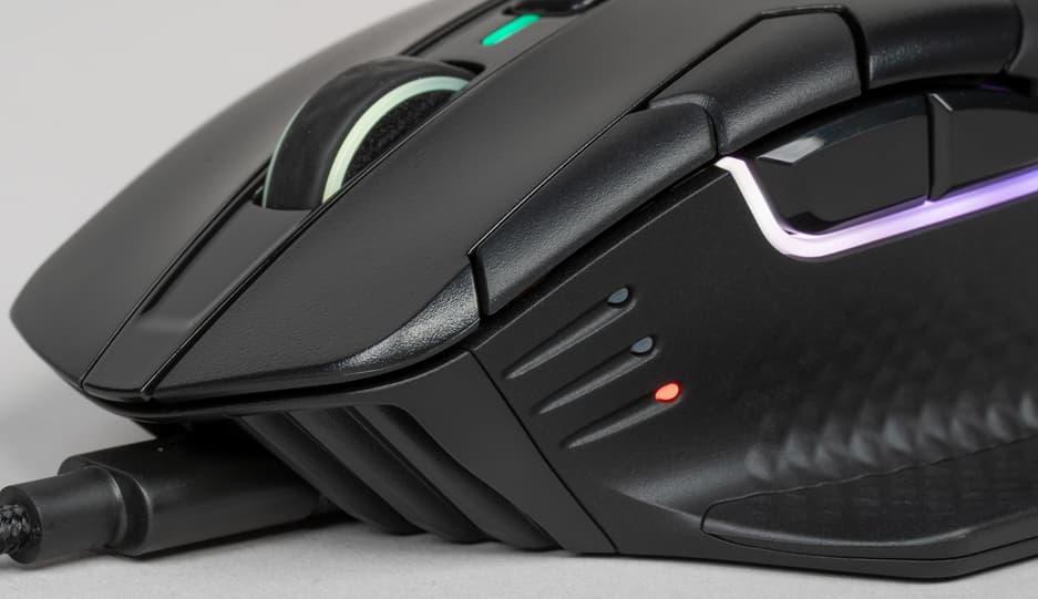 Кстати, о подсветке. Здесь Corsair расстарались. В наличии пять программируемых светодиодных зон: колесико, логотип, одна большая боковая полоса и две маленьких сзади по бокам. В большой полоске стоит сразу четыре независимых светодиода, так что можно настроить и красивые переливающиеся эффекты. А этого в большинстве мышек Corsair не сделаешь просто потому, что зоны подсветки зачастую состоят всего из одного светодиода.