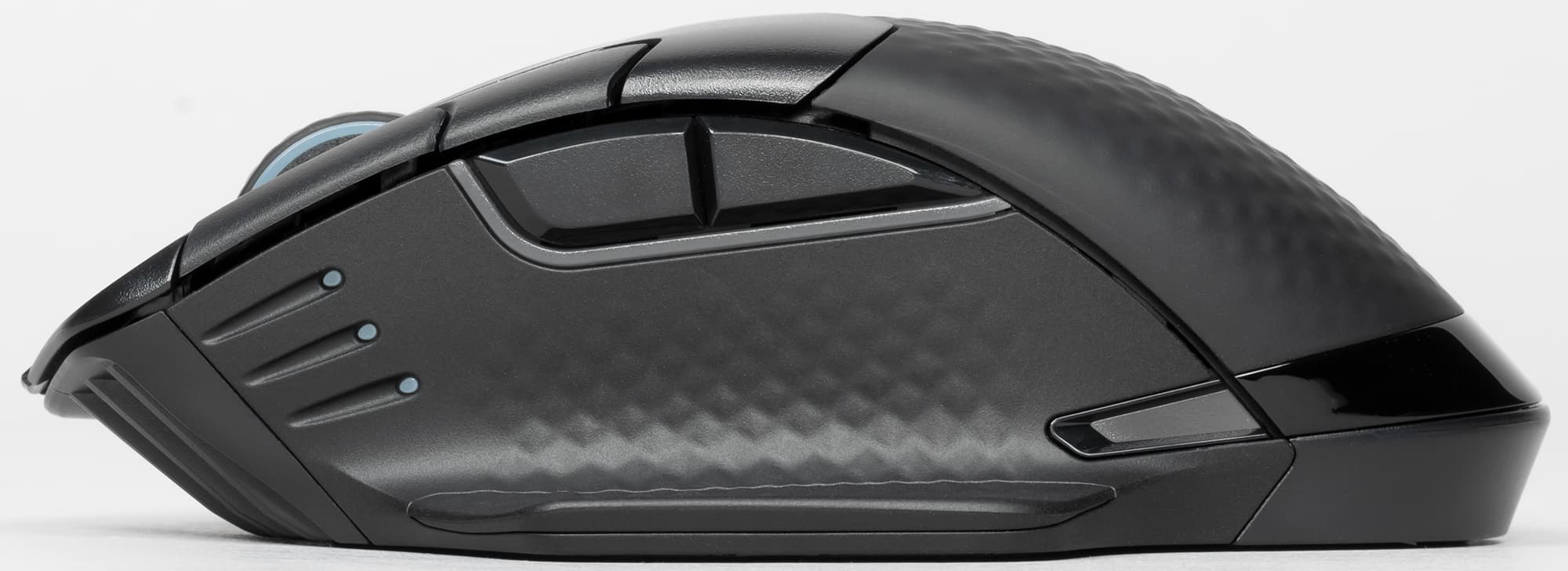 В этой модели не две боковых клавиши, а четыре. Две стандартно расположены на левой панели и на них удобнее всего нажимать большим пальцем. Еще две находятся на левой стороне левой основной клавиши, и до них, очевидно, удобнее дотягиваться указательным пальцем. По умолчанию эти кнопки переключают назад-вперед три режима CPI, светодиодный индикатор которых находится тут же слева.