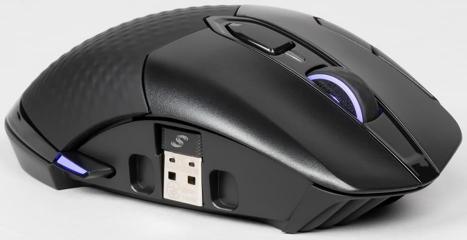 Впрочем, такими показателями сенсора в игровых мышках уже никого не удивишь. А вот частота опроса в 2000 Гц — это уже что-то новое. В этом манипуляторе Corsair используют собственную технологию Slipstream wireless, которая при подключении через ресивер позволяет увеличить частоту опроса аж в два раза. Помимо этого устройства, использующие Slipstream wireless, обладают увеличенной дистанцией подключения (для мышек это 10 метров), а также смогут подключаться к компьютеру через один ресивер. Последнее актуально, наверное, только для фанатов фирмы Corsair. Тем не менее, использовать один «свисток» для подключения и мыши, и гарнитуры, и клавиатуры — весьма удобно.