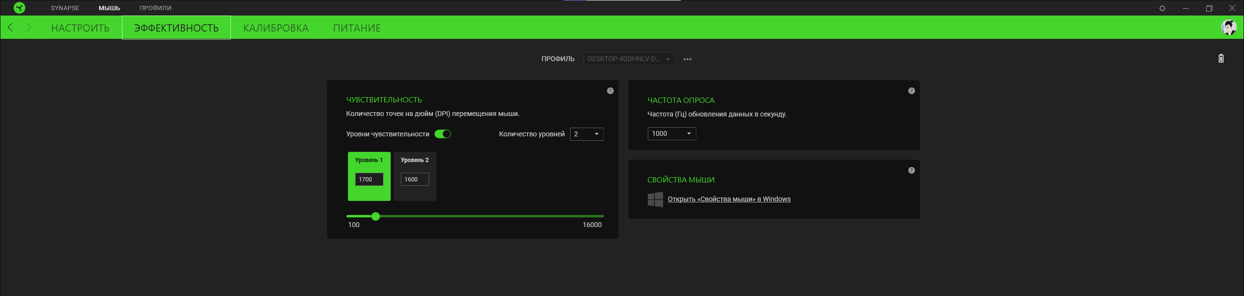 Для подключенной фирменной игровой мышки появляются дополнительные вкладки: эффективность, калибровка и питание.