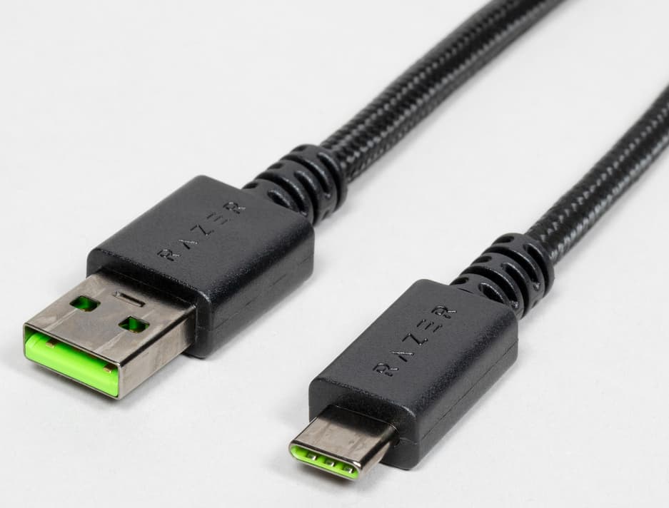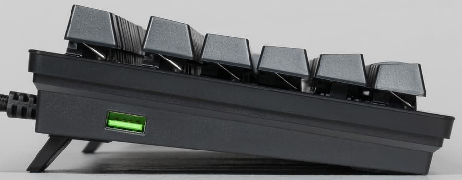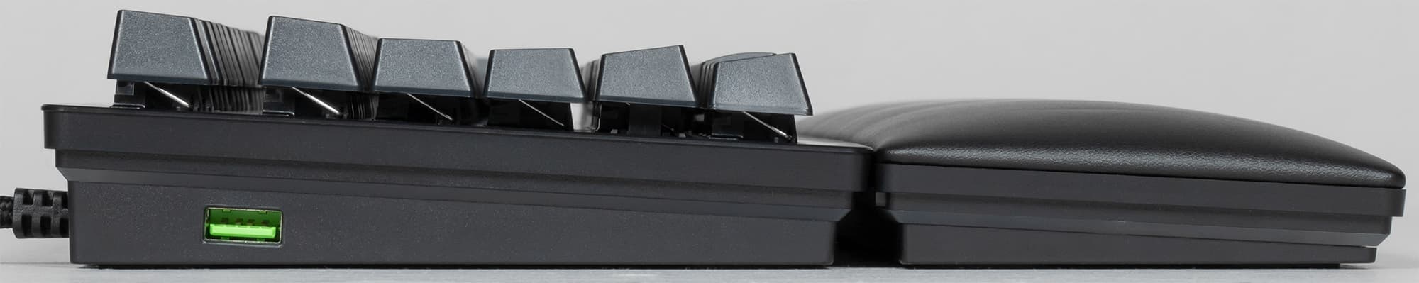 Провод в текстильной оплетке на переднем торце смещен в левую сторону и имеет общую длину 2 метра. Для подключения клавиатуре требуется порт USB Type A 3.0, и еще один такой же порт для работы сквозного порта на самой клавиатуре.