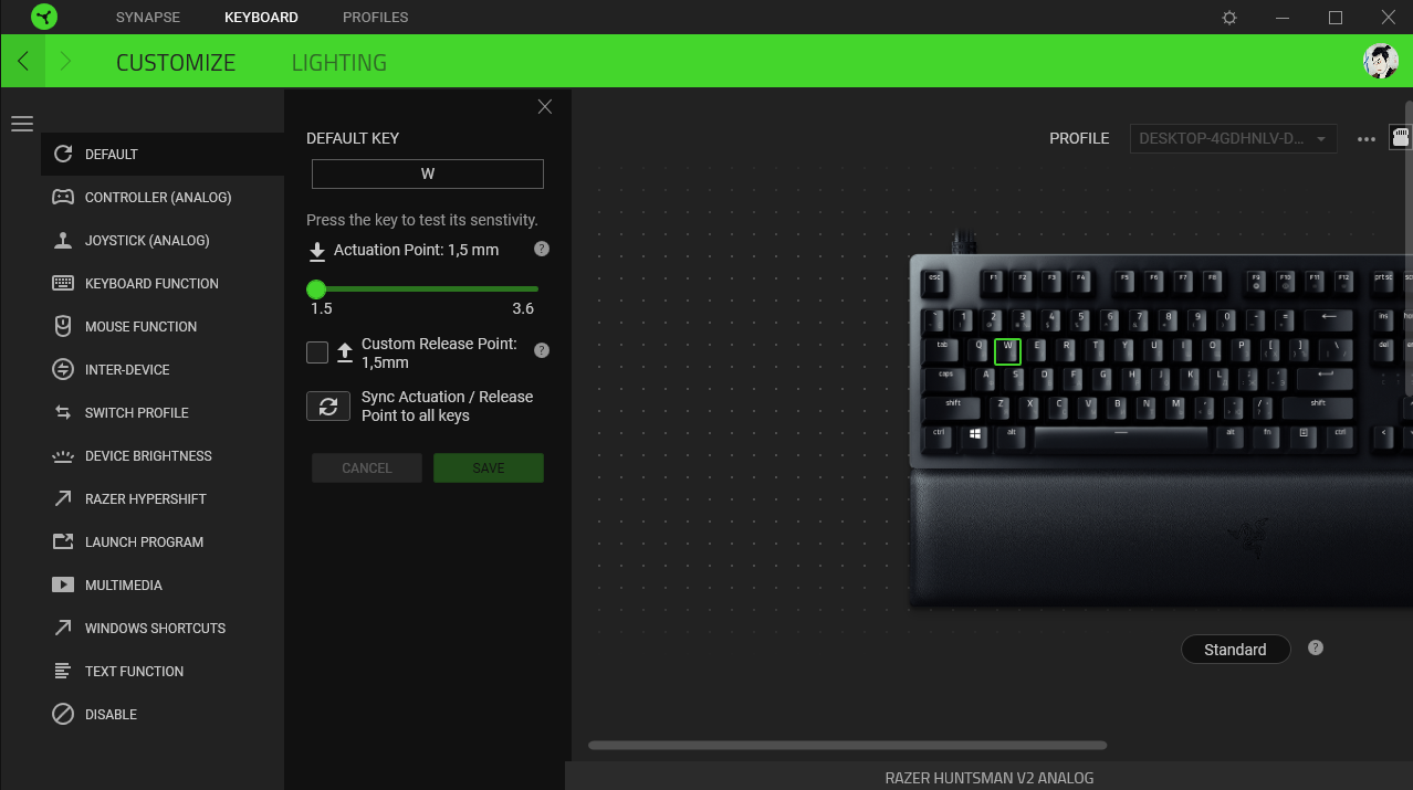 При выборе клавиши вы можете настроить ход срабатывания от 1,5 мм до 3,6 мм. Индивидуально для каждой из клавиш или можнол выставить для одной и затем синхронизировать со всеми остальными.