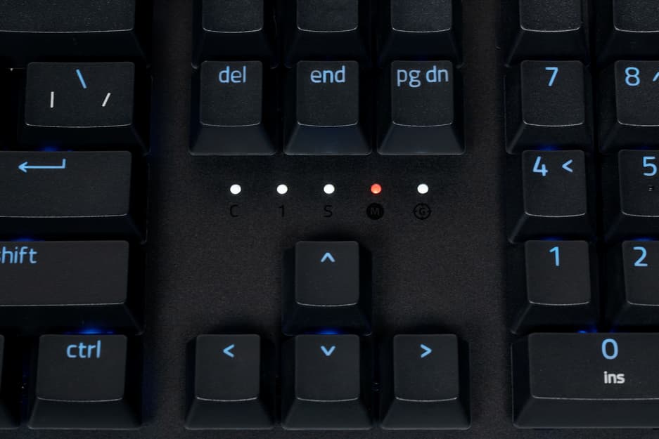 Enter в основном блоке «одноэтажный», есть полноценный цифровой блок. Индикаторы CapsLock, WinLock, ScrollLock расположены над навигационными стрелочками в виде одноцветных светодиодов. Под ними выгравированы небольшие пиктограммы, поясняющие что из них что означает. Сама гравировка еле различима на фоне поверхности.