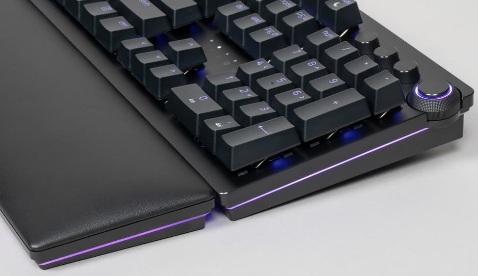 Съемная подставка для рук с RGB подсветкой включается только при стыковке к самой клавиатуре и подключении к ПК.