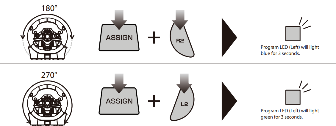 В руле реализована быстрая настройка клавиш. При нажатии и удержании кнопоки Assign, вы можете назначить другое действие на клавиши: L2, R2, левый и правый рычажок, левую и правую педали. Список назначемых действий выглядит так: круг, крестик, треугольник, квадрат, L1, R1, L2, R2, L3, R3, движение левыми или правым стиком, движение крестовины.