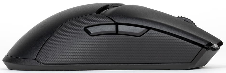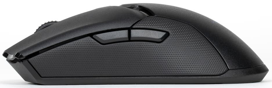 Левый и правый бок манипулятора идентичны и выполнены из прорезиненного покрытия с рельефом в виде маленьких гексагонов. На левом боку размещены две навигационные кнопки с глянцевой поверхностью, которые немного выступают из корпуса на 0,5–1 мм. Так что, несмотря на симметричный дизайн мышь удобна исключительно для правшей.