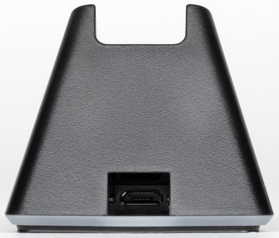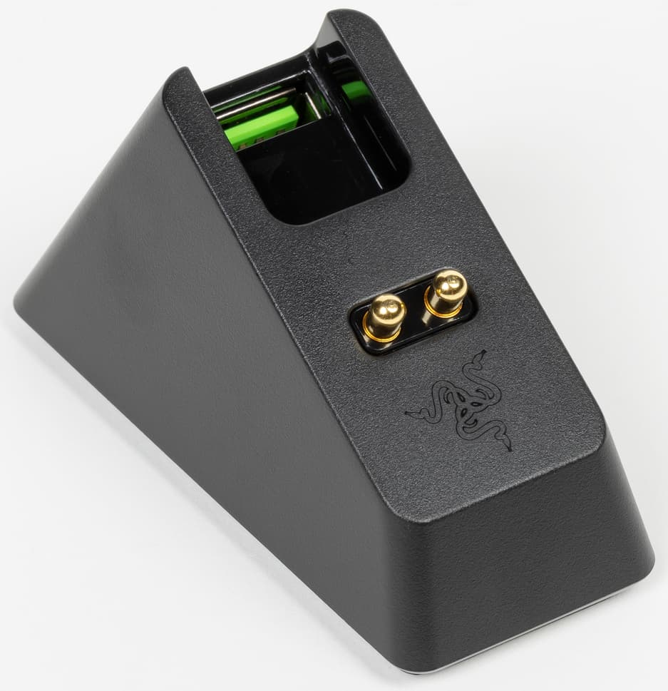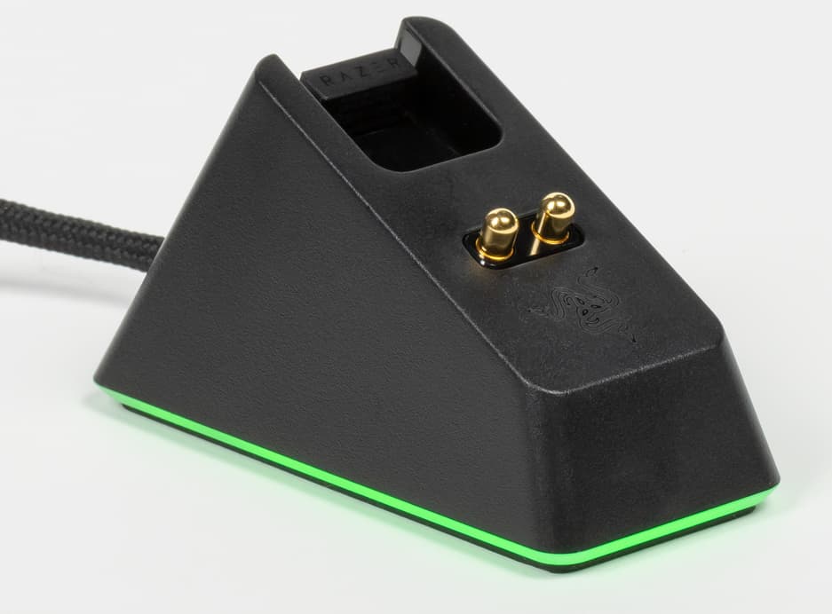 По общей форме это усеченная под наклоном пирамида, которая оборудована своей индивидуальной подсветкой и замечательно выглядит на столе. На верхней площадке находятся два подпружиненных контакта. Чуть ниже них расположен небольшой встроенный магнит, который направляет манипулятор в нужные пазы при установке на зарядку. Поэтому пользователю не нужно задумываться о правильной ориентации мыши, магнит выравнивают её автоматически. Это удобно.