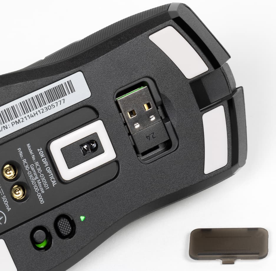 На переднем торце манипулятора расположен порт micro-USB B, который позволяет при необходимости подключить мышь напрямую к компьютеру проводом из комплекта, без адаптера. Это может пригодиться при сценарии, если у вас неожиданно закончился заряд аккумулятора в мышке (рассчитанный на 70 часов автономной работы) и нужно как можно скорее возобновить свою дееспособность.