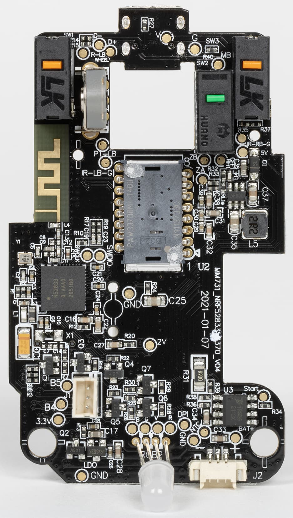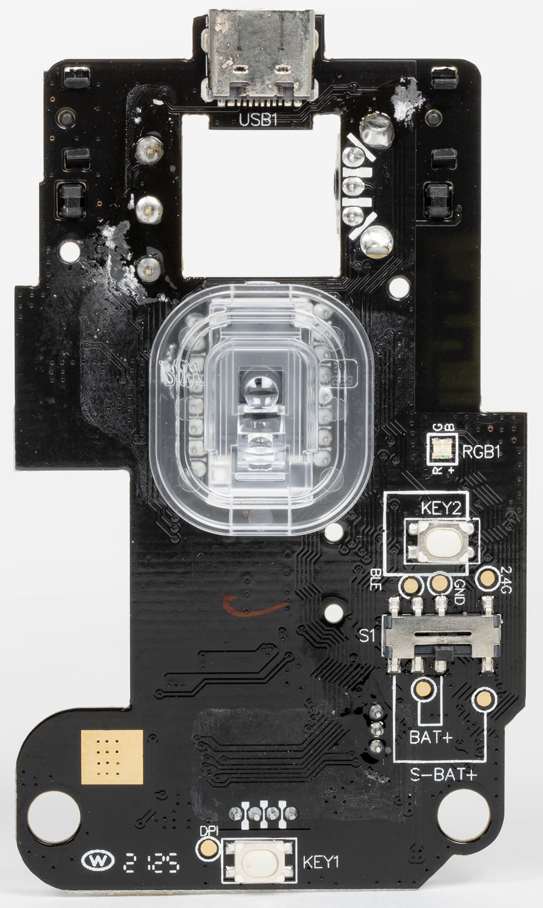 Нижняя сторона платы. Вверху расположен порт для зарядки и прямого подключения мышки к ПК. RGB1 - светодиод для отображения выбранного профиля. Ниже кнопка сопряжения KEY2. Еще ниже трехпозиционный переключатель. Хорошо видно, что в среднем положении аккумуляторная батарея полностью отключается от цепей. Кнопка KEY1 по умолчанию отвечает за смену разрешение сенсора.