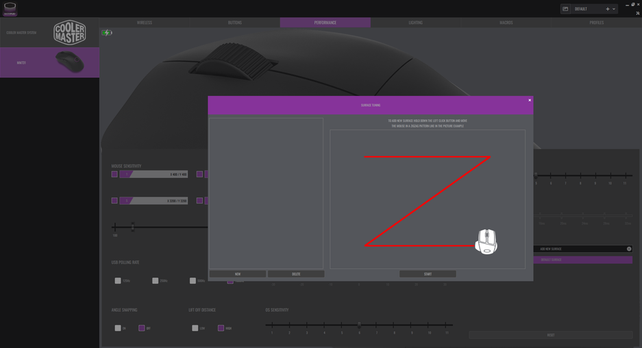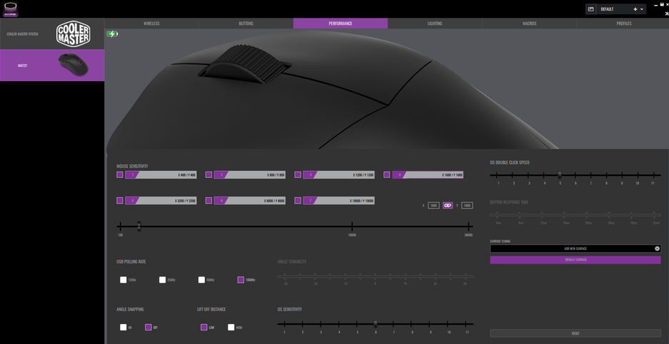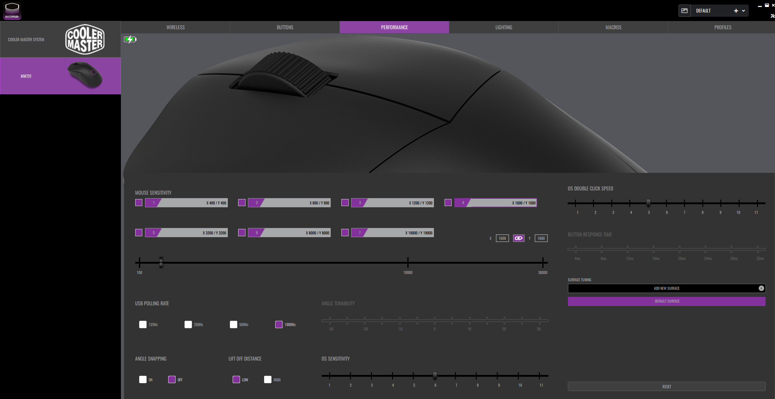 В разделе “Perfomance” можно настроить высоту подъема (тут только два варианта: low и high, в миллиметрах не указывается), частота опроса устройства, разрешение сенсора, профили сенсора, чувствительность курсора на рабочем столе, сглаживание углов и т.д.