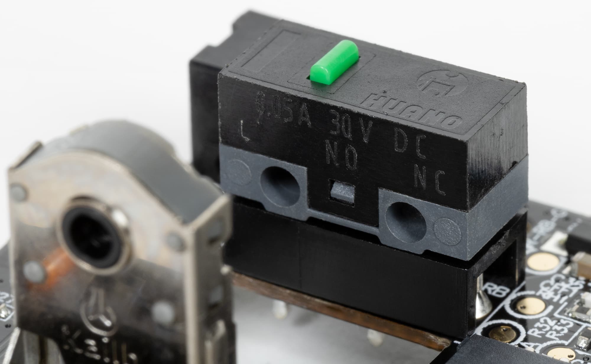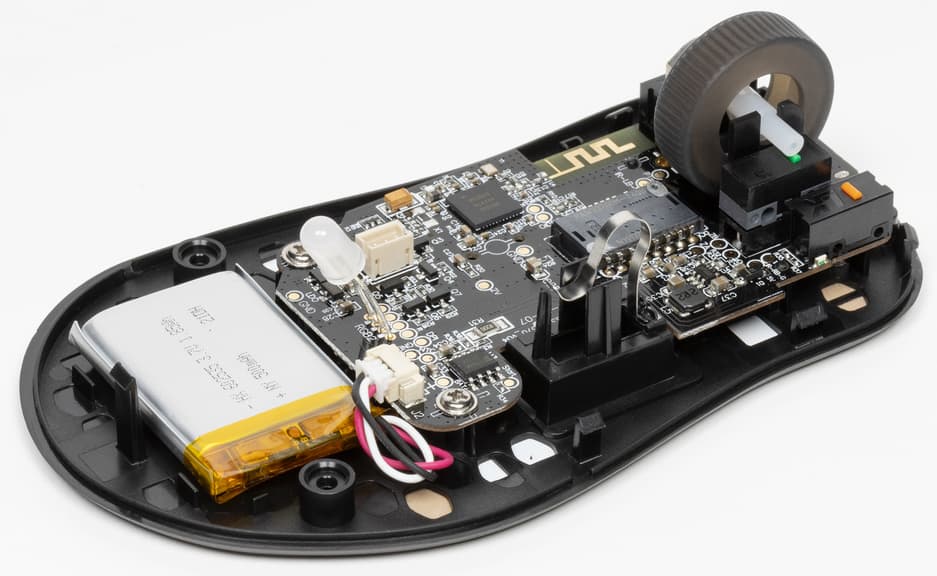 Для регистрации нажатия колеса прокрутки стоит отдельный переключатель фирмы Huano. Зигзагообразная дорожка на печатной плате в левой верхней части этой фотографии это антенна для радиоканала.