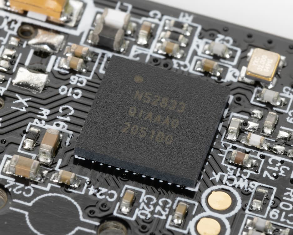 Встроенный микропроцессор фирмы Nordic Semiconductors: N52833 Q1AAA0 205180. Это однокристальная система на базе ядра Arm Cortex-M4 (64 МГц) со своей встроенной памятью, отвечает за проводные и беспроводные интерфейсы.