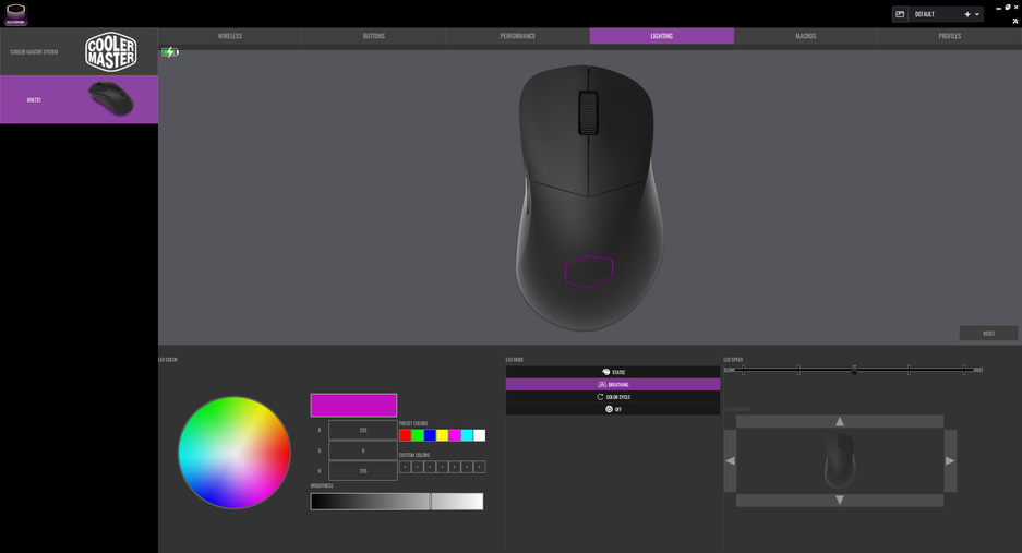 Выше кнопки сопряжения, расположен цветной светодиодный индикатор выбранного профиля, который можно менять на лету при помощи кнопки, которая также находится на днище в нижней части. Каждому профилю соответствует свой цвет. По умолчанию у вас есть семь профилей, которые при желании можно настроить в фирменном ПО Cooler Master Master+.