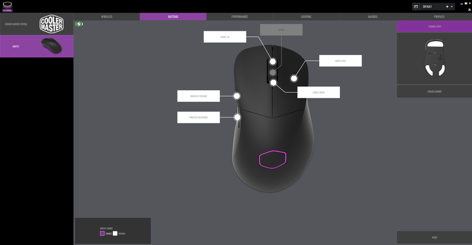 В разделе “Buttons” можно назначать новые действия на кнопки манипулятора. Предусмотрена функция кнопки модификатора, здесь она называется “combo” кнопка. При удержании этой кнопки и нажатии любой другой настроенной будет выполняться назначенное действие. Из вариантов вы можете выбрать: смену профиля, повышение или понижение чувствительности данного профиля, выключение/включение сенсора, выполнение макроса и т.д.