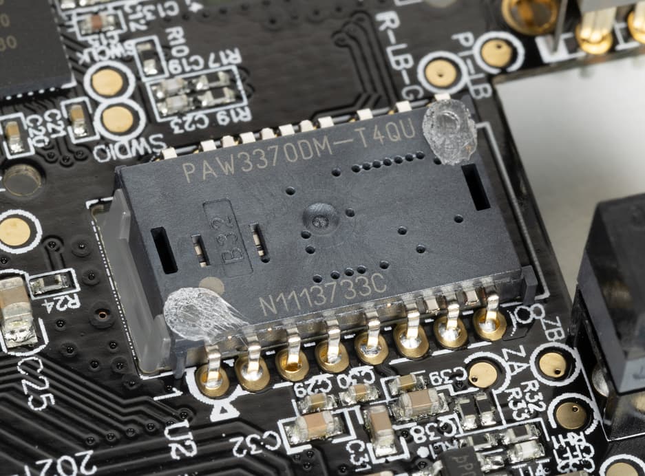 Оптический сенсор PixArt с маркировкой: PAW3370DM-T4QU. Разрешение сенсора составляет 19 000 DPI, а минимальный шаг равен 100 DPI.